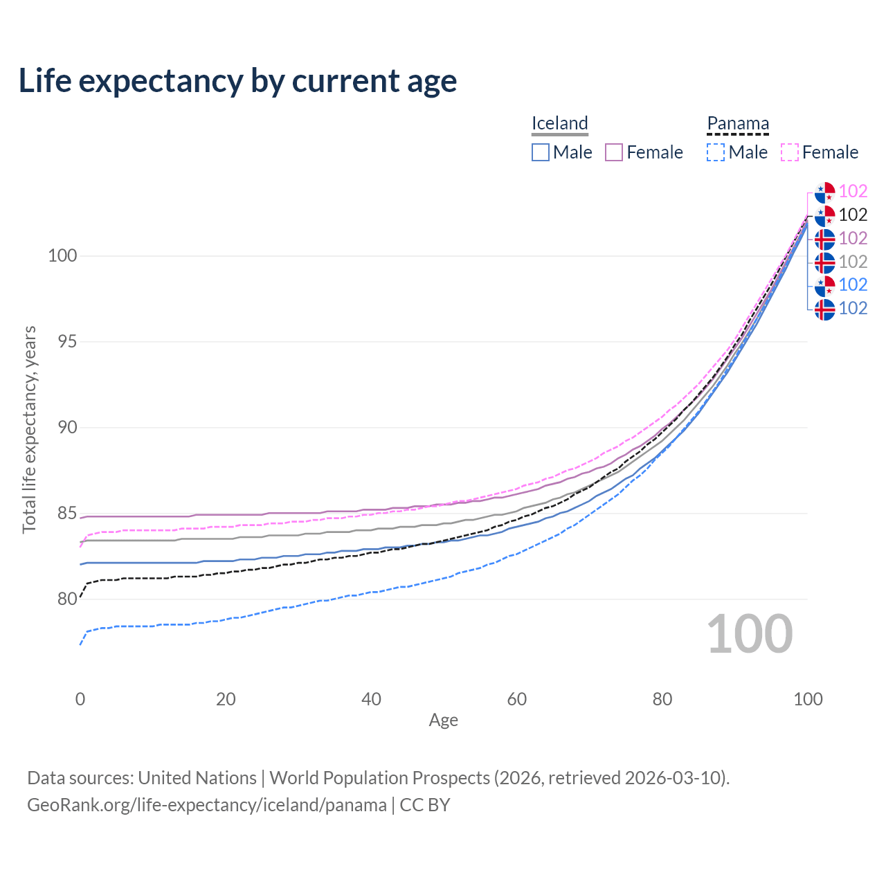 This life expectancy calculator shows the odds of living to 100, 95, 90, and below based on current age for both males and females in Iceland and Panama, along with mean and median age of death. The calculations are based on the 2026 life tables (actuarial tables) from the UN World Population Prospects.