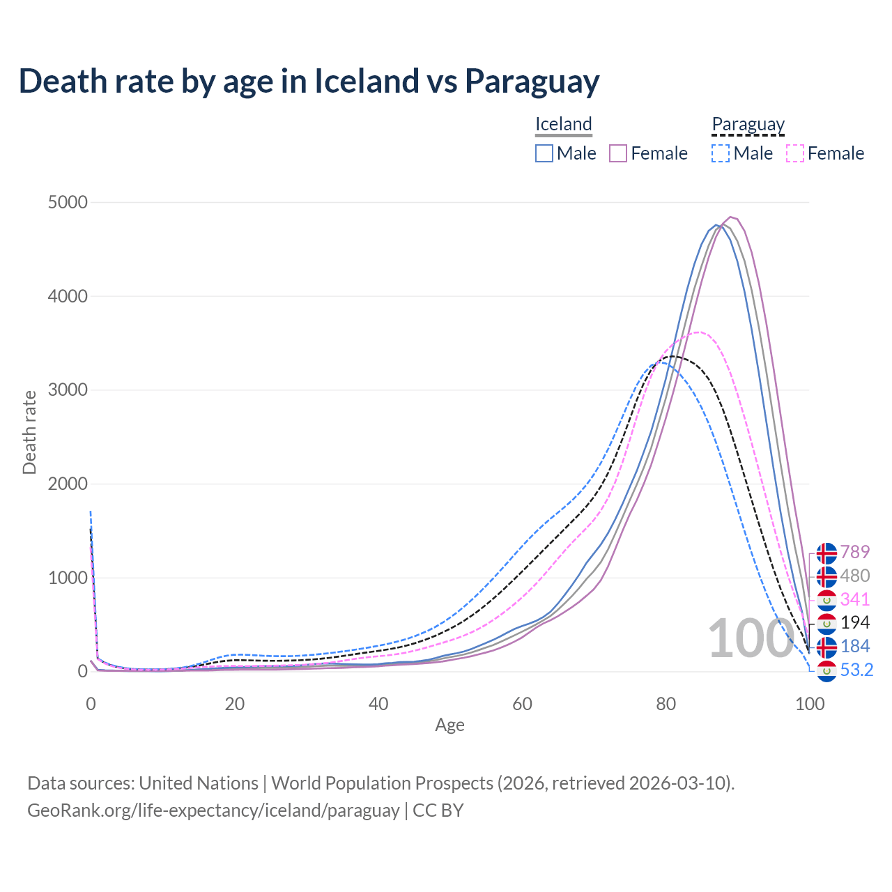 This life expectancy calculator shows the odds of living to 100, 95, 90, and below based on current age for both males and females in Iceland and Paraguay, along with mean and median age of death. The calculations are based on the 2026 life tables (actuarial tables) from the UN World Population Prospects.
