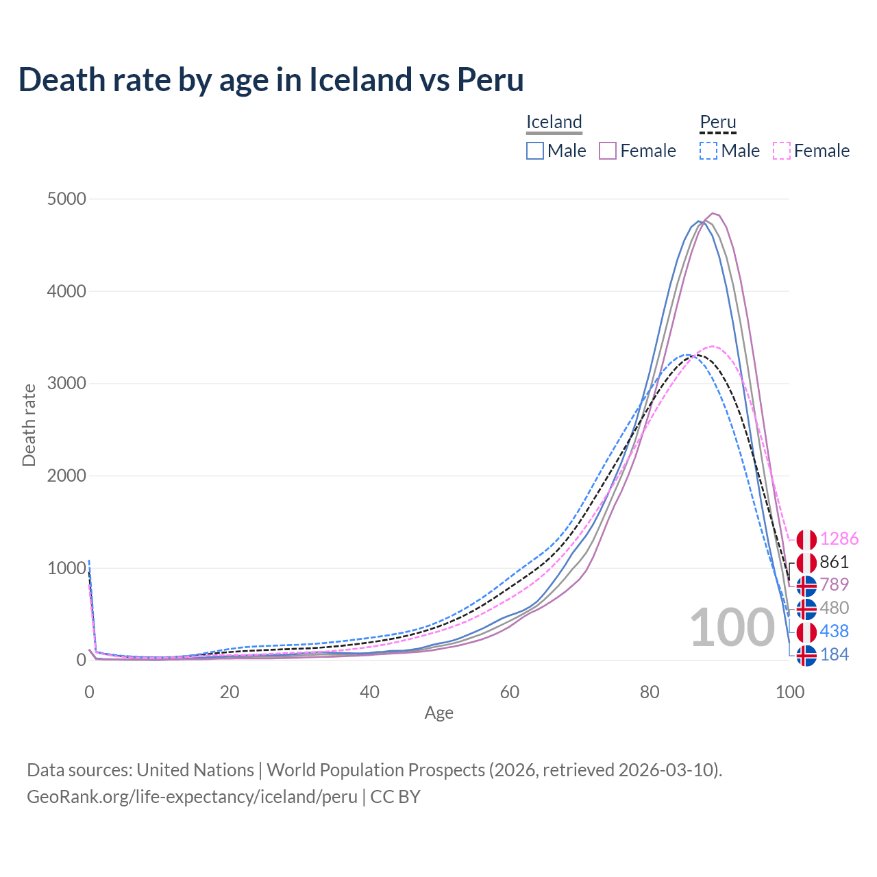 This life expectancy calculator shows the odds of living to 100, 95, 90, and below based on current age for both males and females in Iceland and Peru, along with mean and median age of death. The calculations are based on the 2026 life tables (actuarial tables) from the UN World Population Prospects.