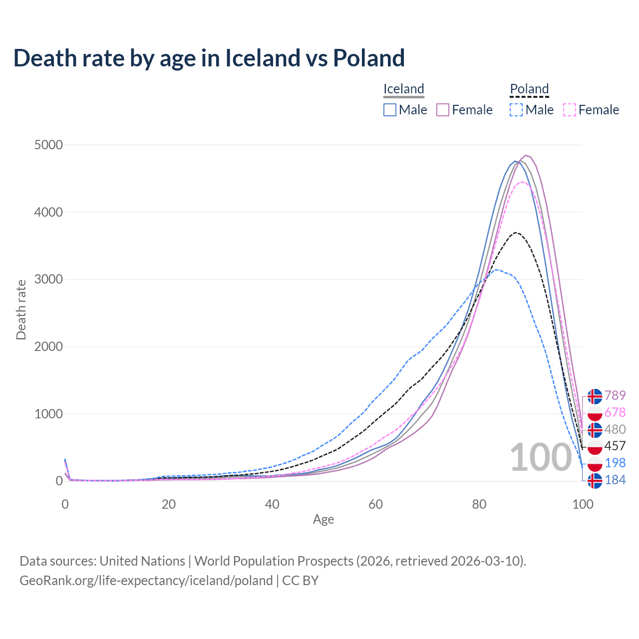 This life expectancy calculator shows the odds of living to 100, 95, 90, and below based on current age for both males and females in Iceland and Poland, along with mean and median age of death. The calculations are based on the 2026 life tables (actuarial tables) from the UN World Population Prospects.