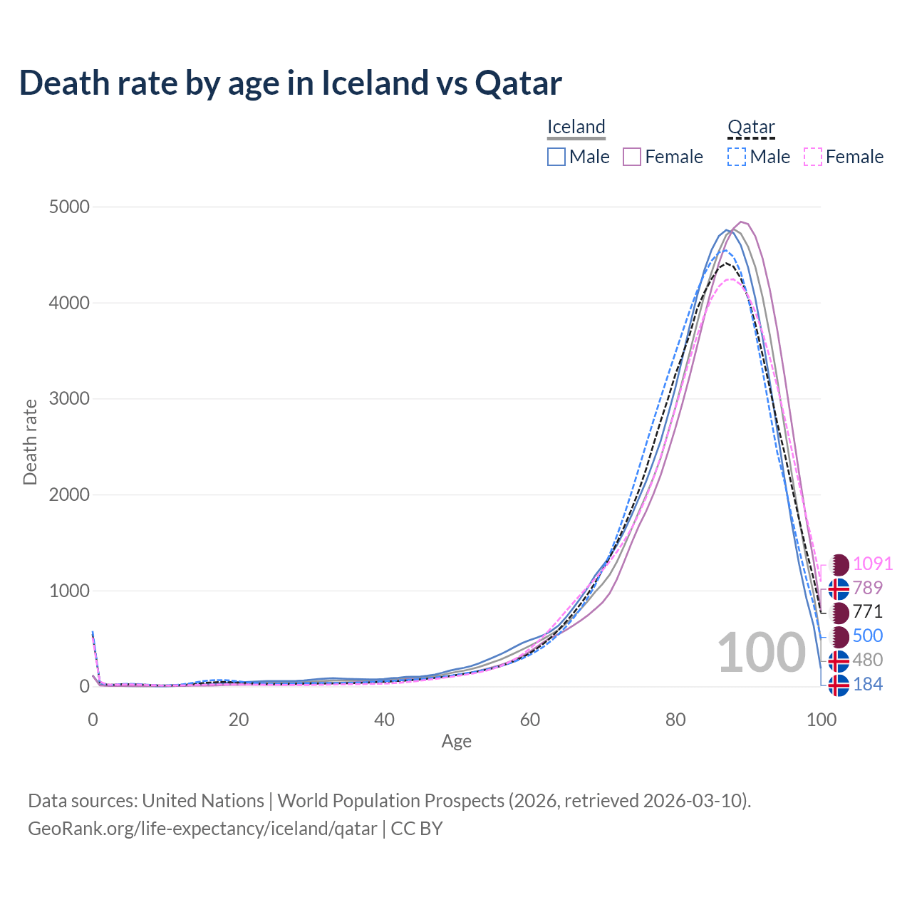 In Iceland, the most common age of death is 88, compared to 87 in Qatar. The median age of death is 85.9 in Iceland and 85.1 in Qatar, meaning only half of each cohort is expected to live past that age.