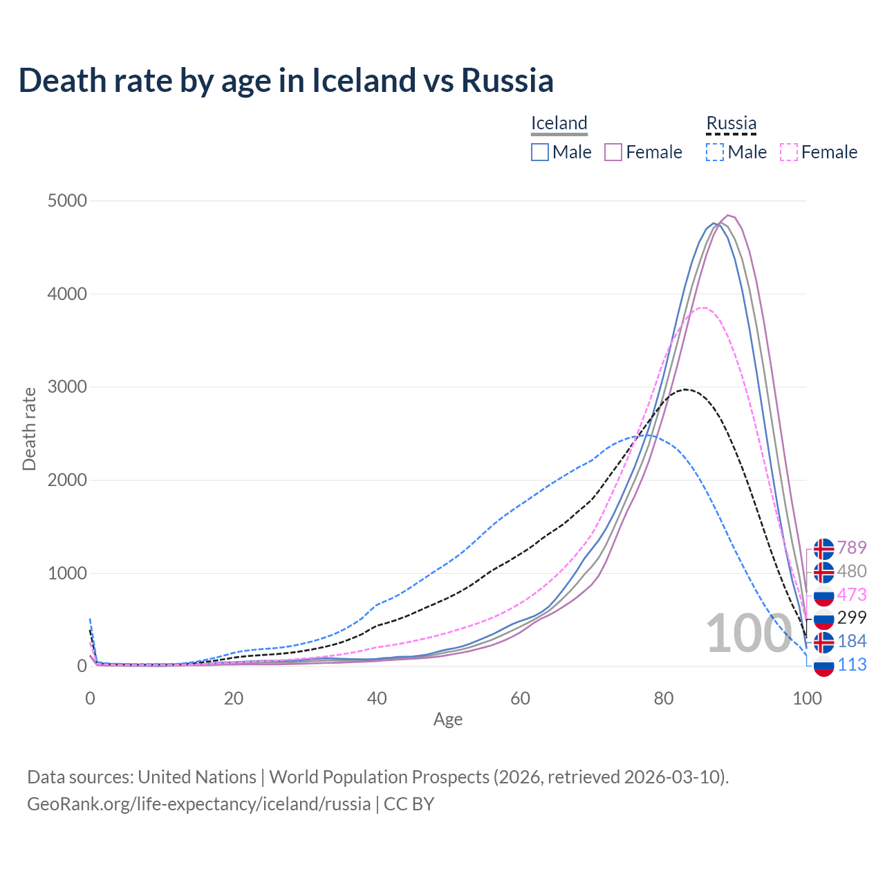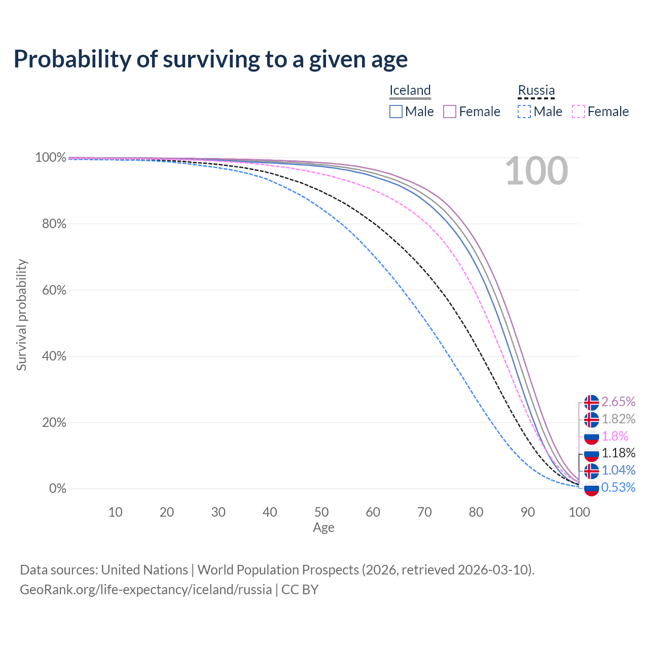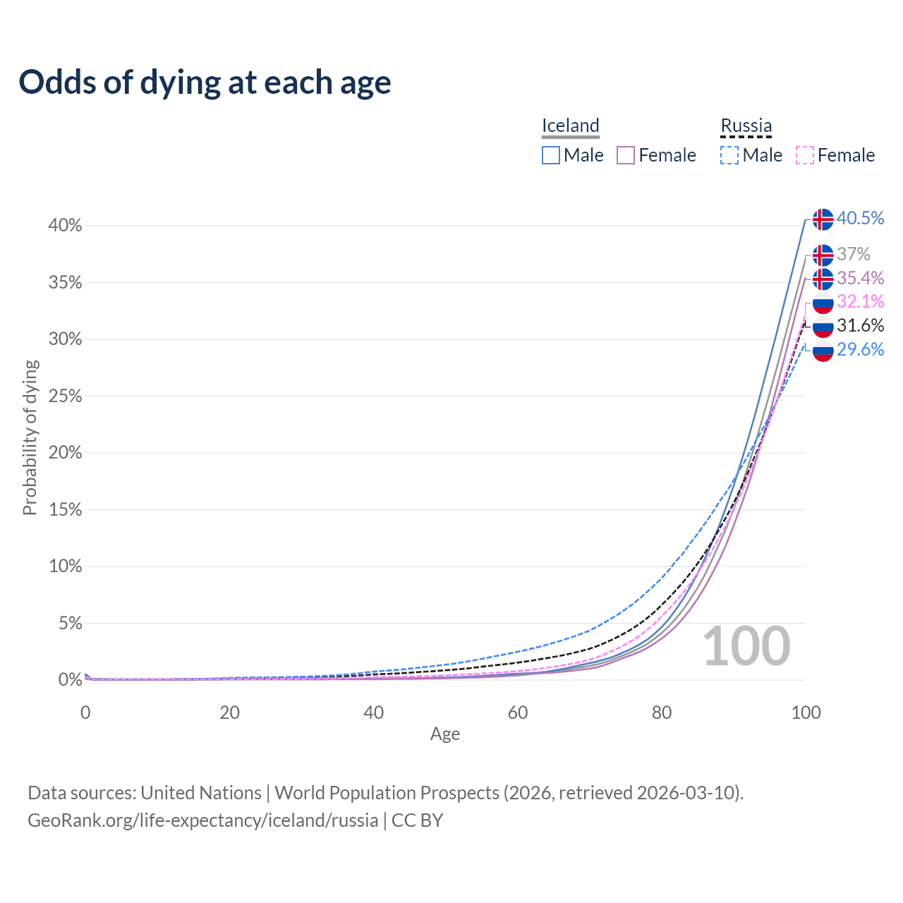This life expectancy calculator shows the odds of living to 100, 95, 90, and below based on current age for both males and females in Iceland and Russia, along with mean and median age of death. The calculations are based on the 2026 life tables (actuarial tables) from the UN World Population Prospects.