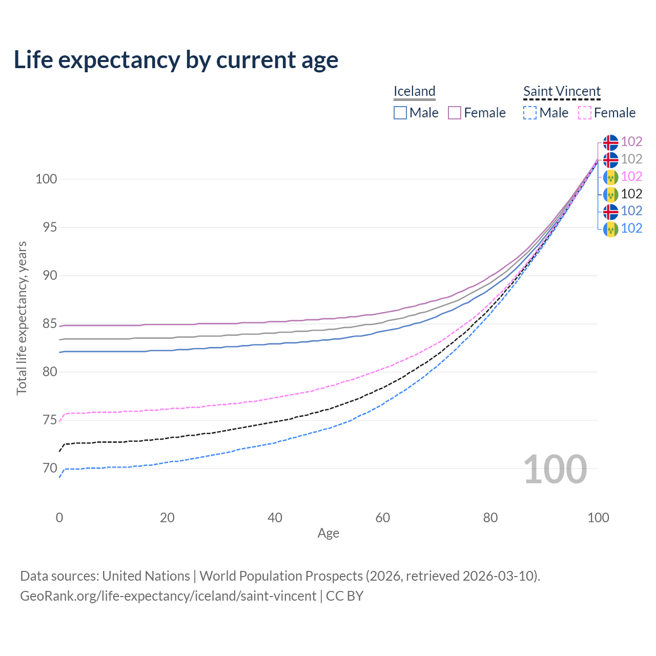 This life expectancy calculator shows the odds of living to 100, 95, 90, and below based on current age for both males and females in Iceland and Saint Vincent, along with mean and median age of death. The calculations are based on the 2026 life tables (actuarial tables) from the UN World Population Prospects.