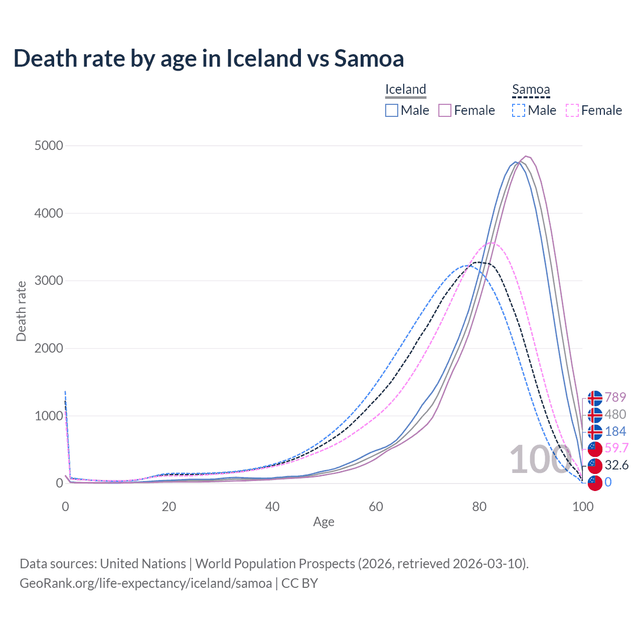 In Iceland, the most common age of death is 88, compared to 80 in Samoa. The median age of death is 85.9 in Iceland and 75.9 in Samoa, meaning only half of each cohort is expected to live past that age.