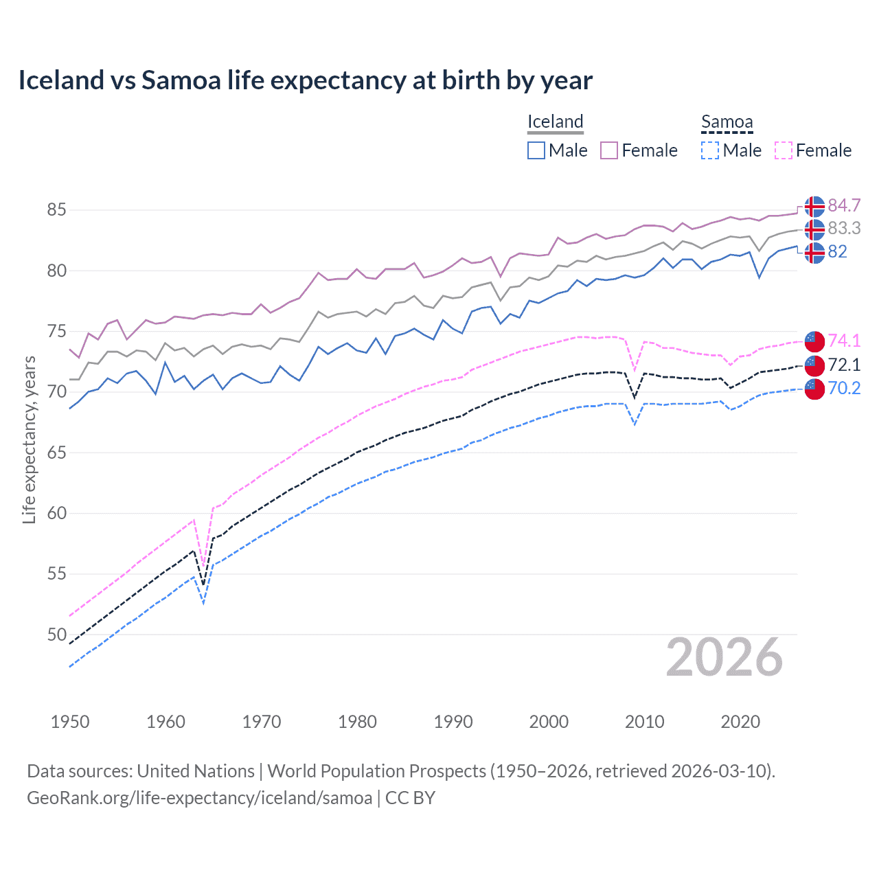 The average life expectancy at birth is 83.3 years in Iceland vs 72.1 in Samoa. Iceland is ranked 18/197 by life expectancy, and Samoa is 124/197. In Iceland, the life expectancy is 82 years for males and 84.7 years for females. In Samoa, it's 70.2 years for males and 74.1 years for females.