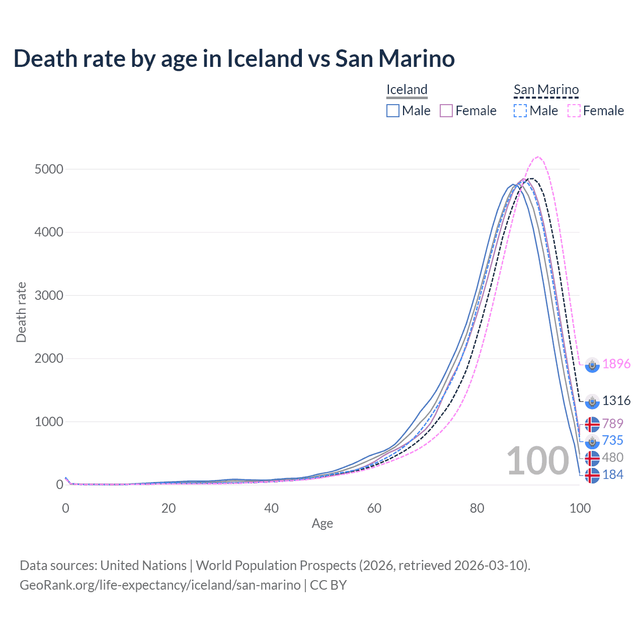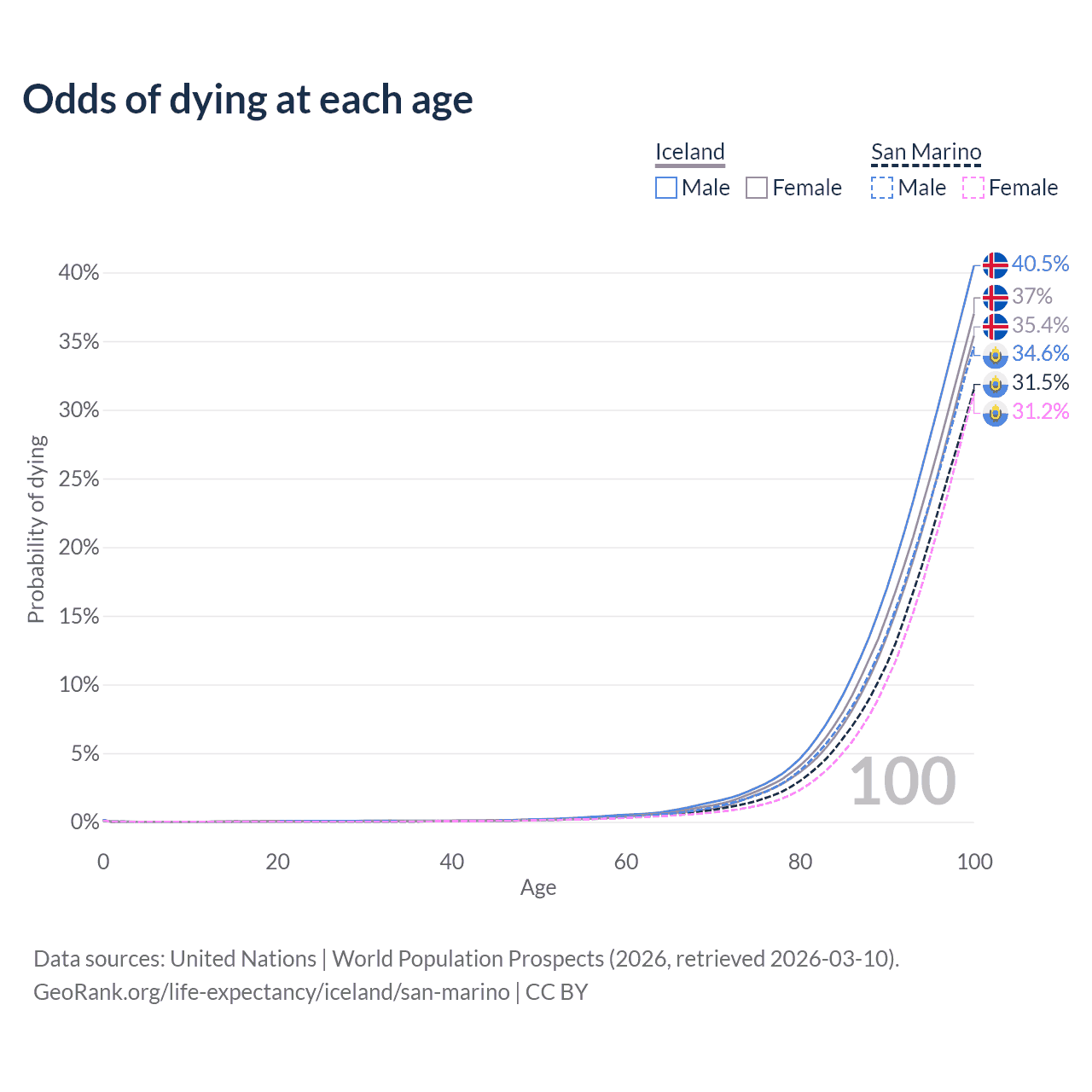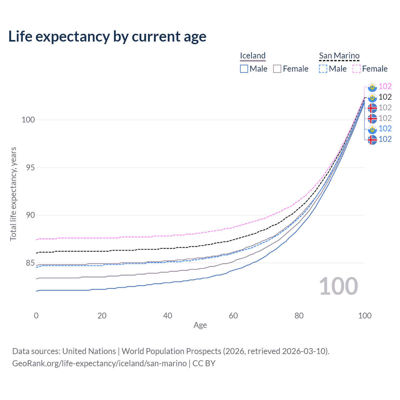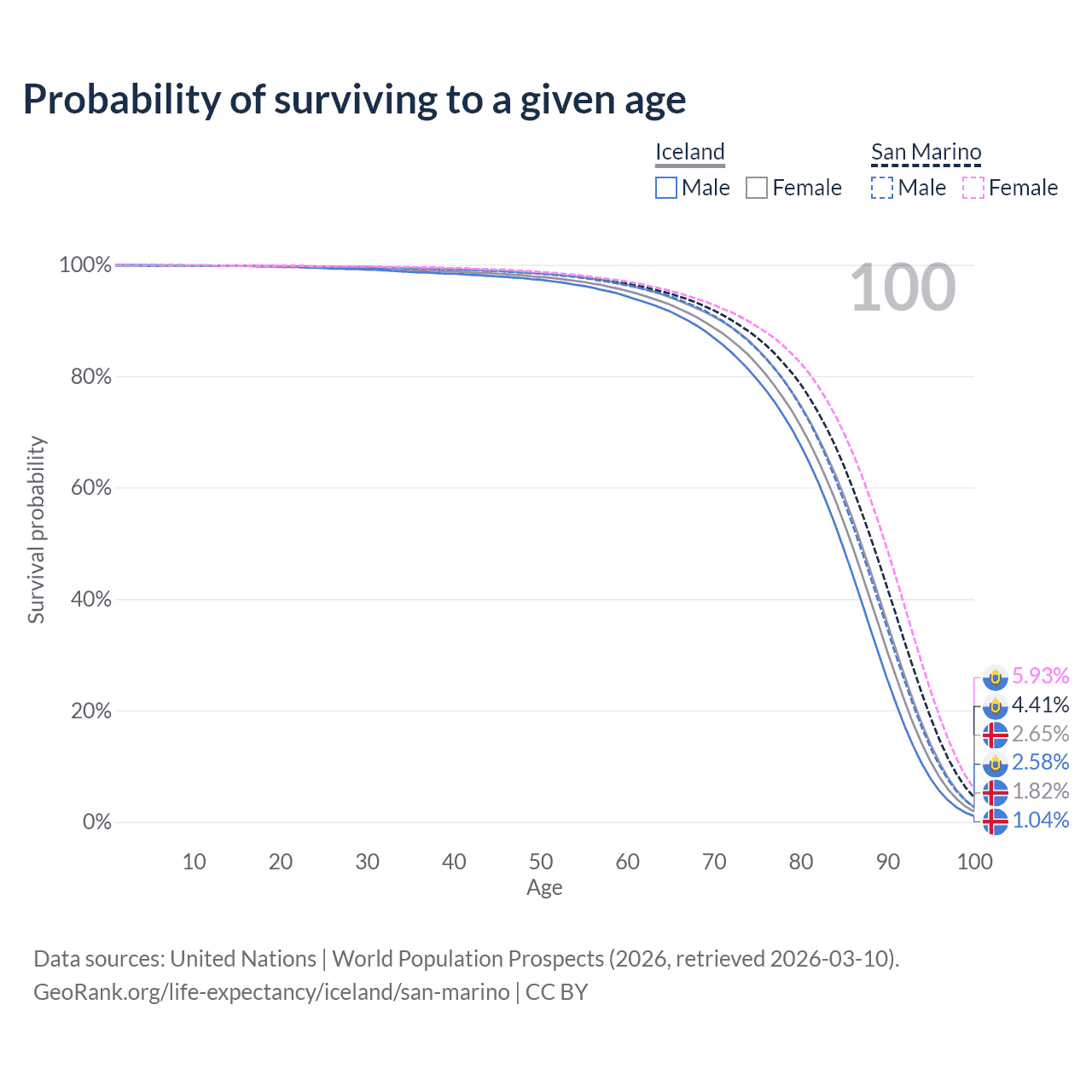This life expectancy calculator shows the odds of living to 100, 95, 90, and below based on current age for both males and females in Iceland and San Marino, along with mean and median age of death. The calculations are based on the 2026 life tables (actuarial tables) from the UN World Population Prospects.