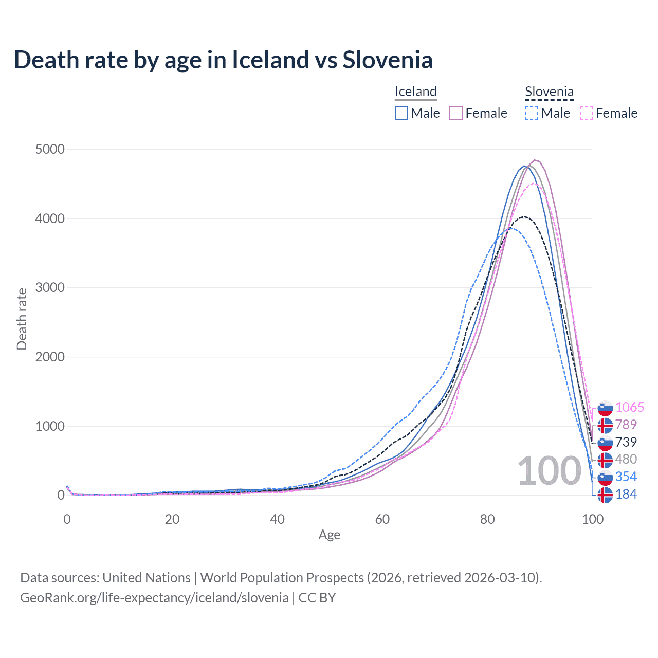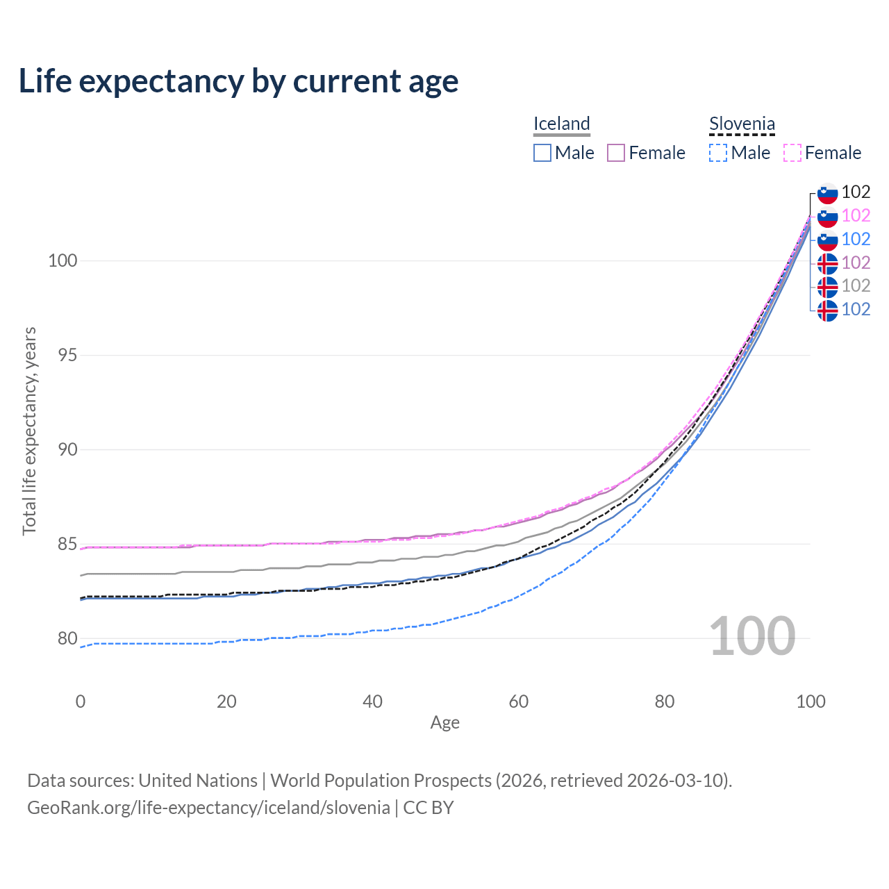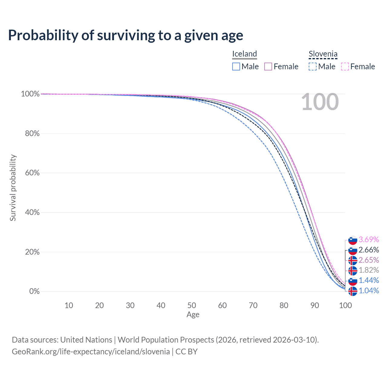 This life expectancy calculator shows the odds of living to 100, 95, 90, and below based on current age for both males and females in Iceland and Slovenia, along with mean and median age of death. The calculations are based on the 2026 life tables (actuarial tables) from the UN World Population Prospects.