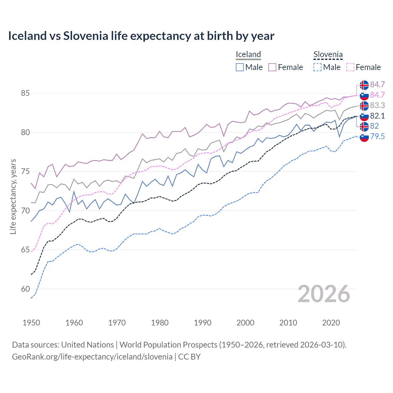 The average life expectancy at birth is 83.3 years in Iceland vs 82.1 in Slovenia. Iceland is ranked 18/197 by life expectancy, and Slovenia is 33/197. In Iceland, the life expectancy is 82 years for males and 84.7 years for females. In Slovenia, it's 79.5 years for males and 84.7 years for females.