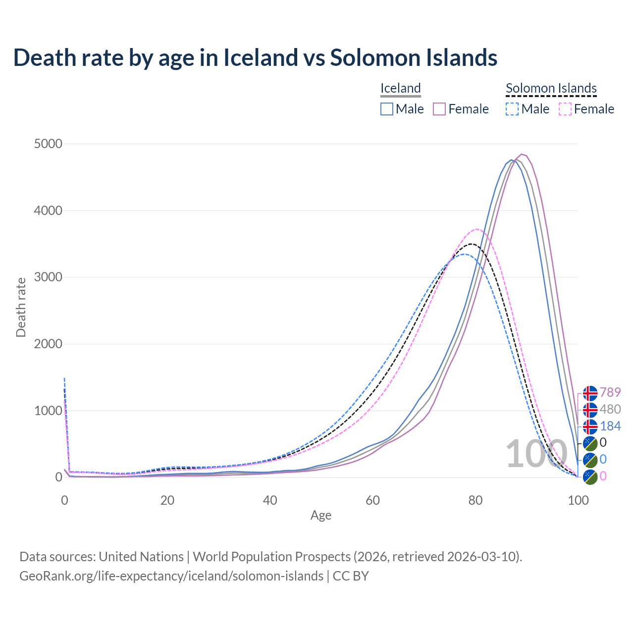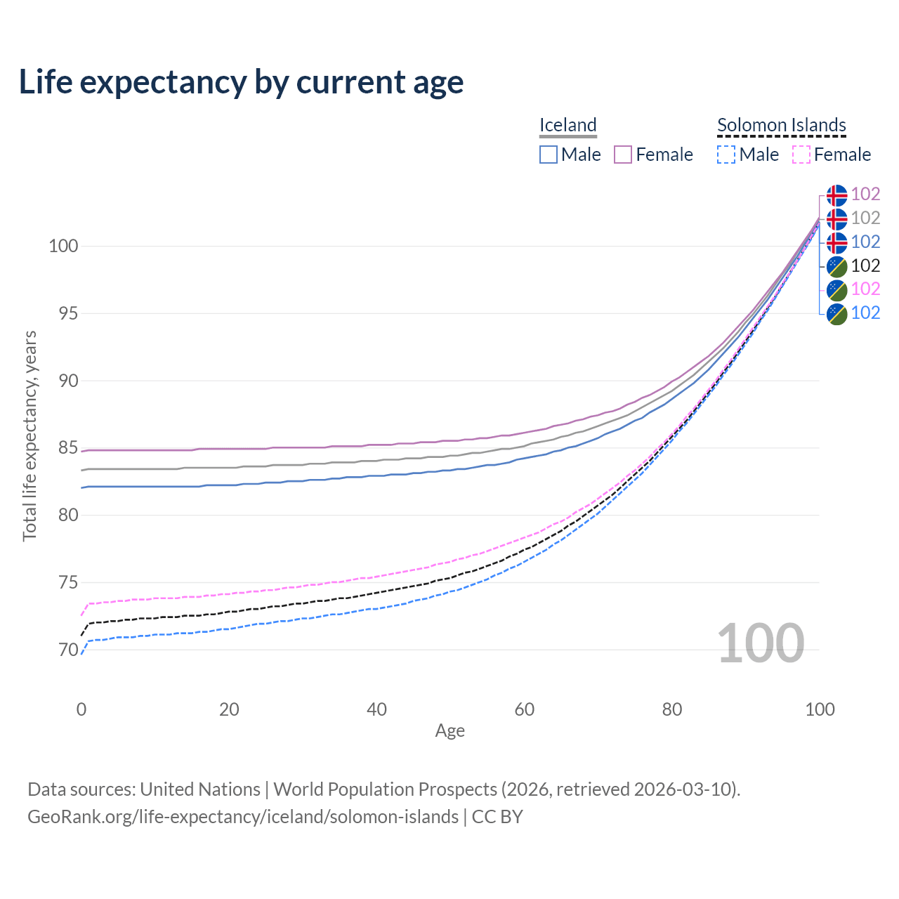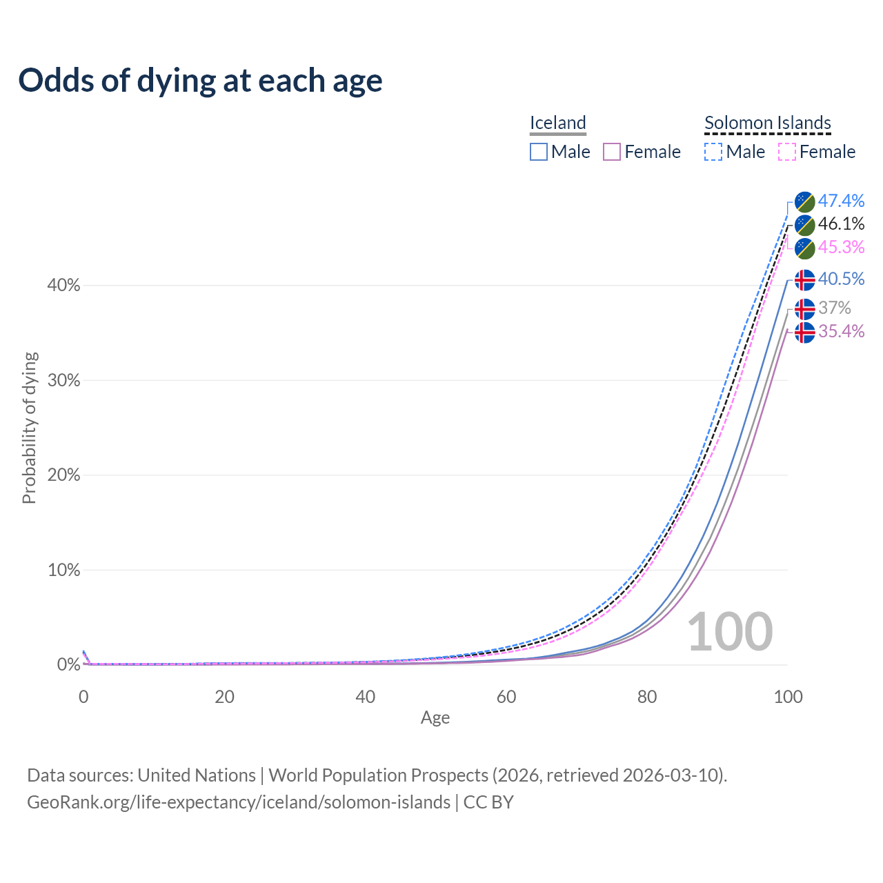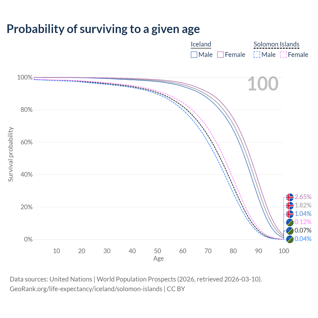 This life expectancy calculator shows the odds of living to 100, 95, 90, and below based on current age for both males and females in Iceland and the Solomon Islands, along with mean and median age of death. The calculations are based on the 2026 life tables (actuarial tables) from the UN World Population Prospects.