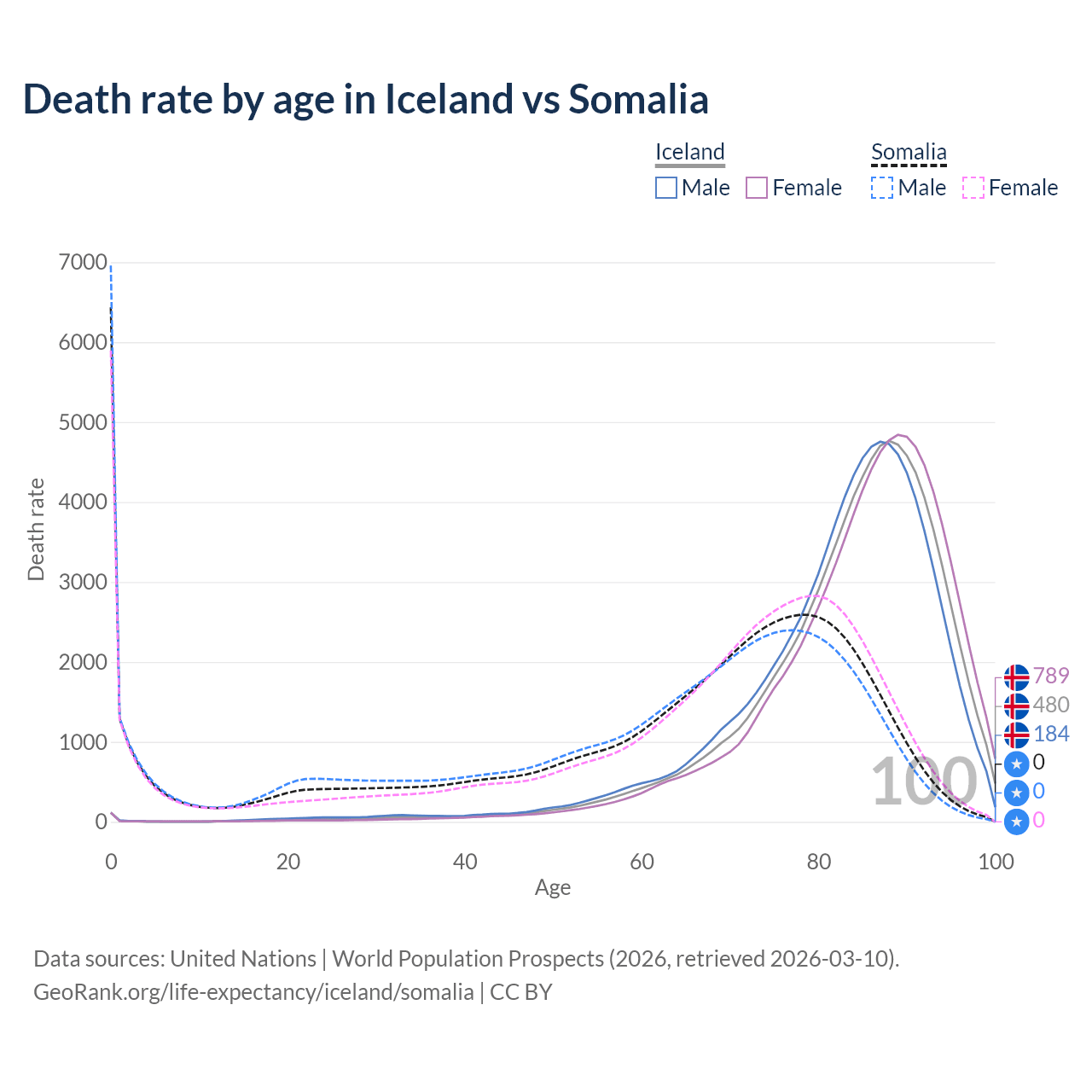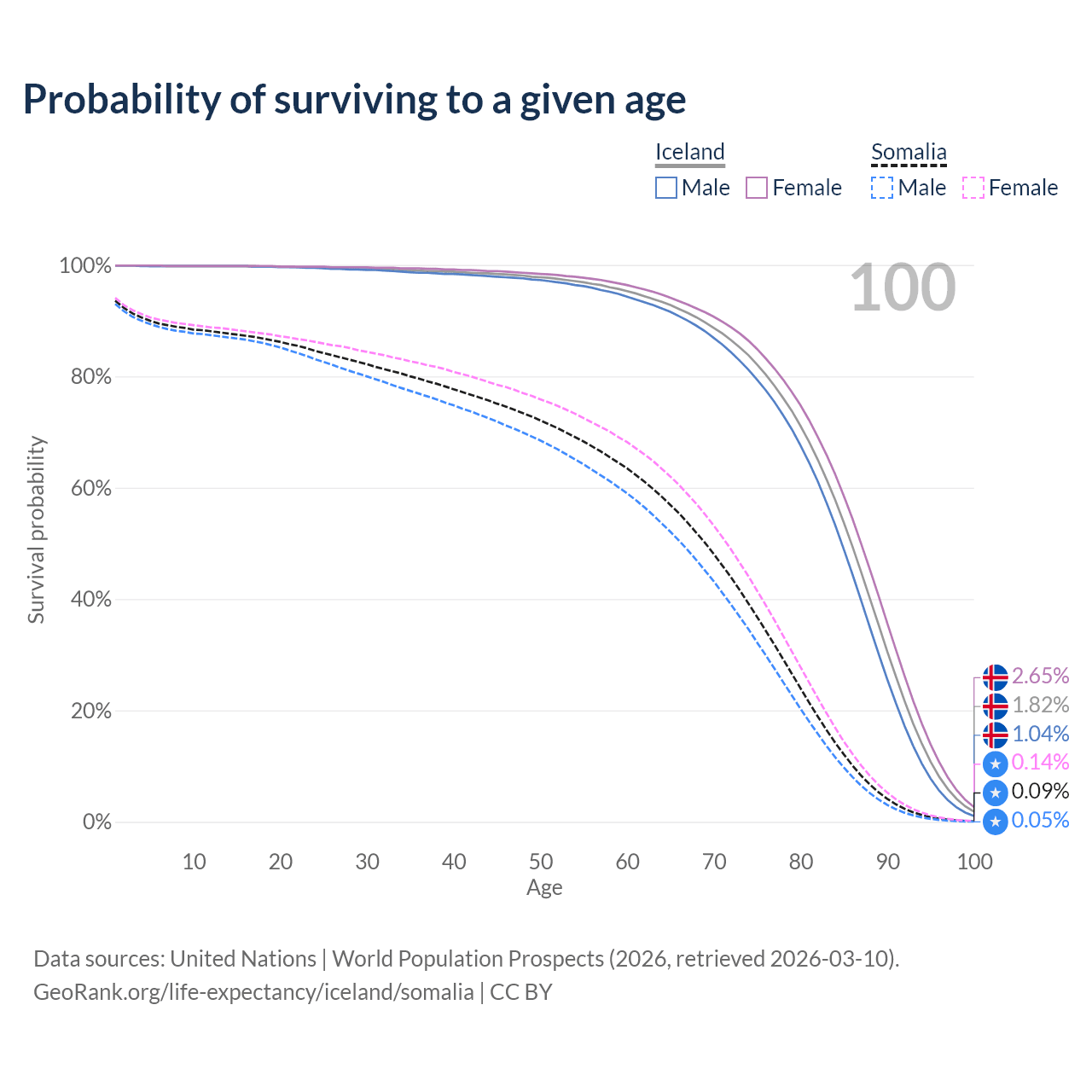 This life expectancy calculator shows the odds of living to 100, 95, 90, and below based on current age for both males and females in Iceland and Somalia, along with mean and median age of death. The calculations are based on the 2026 life tables (actuarial tables) from the UN World Population Prospects.