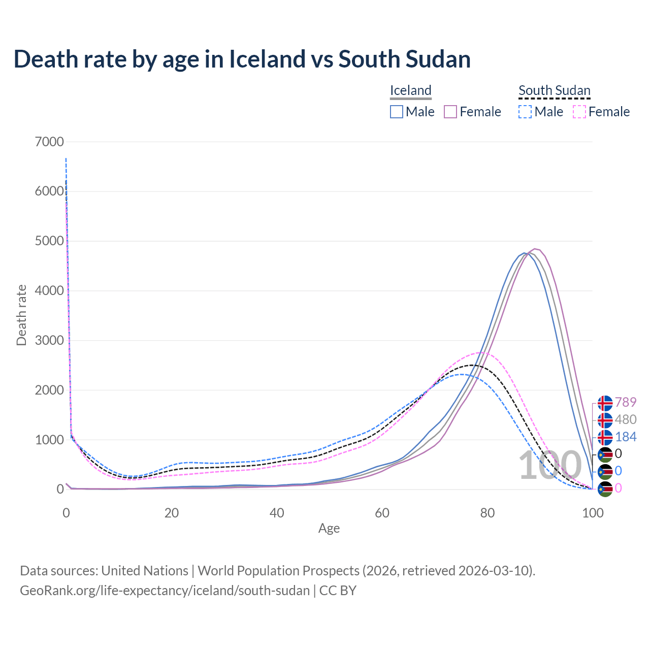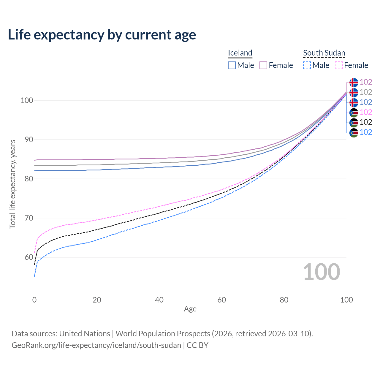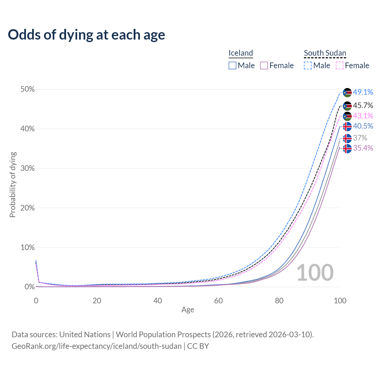 This life expectancy calculator shows the odds of living to 100, 95, 90, and below based on current age for both males and females in Iceland and South Sudan, along with mean and median age of death. The calculations are based on the 2026 life tables (actuarial tables) from the UN World Population Prospects.