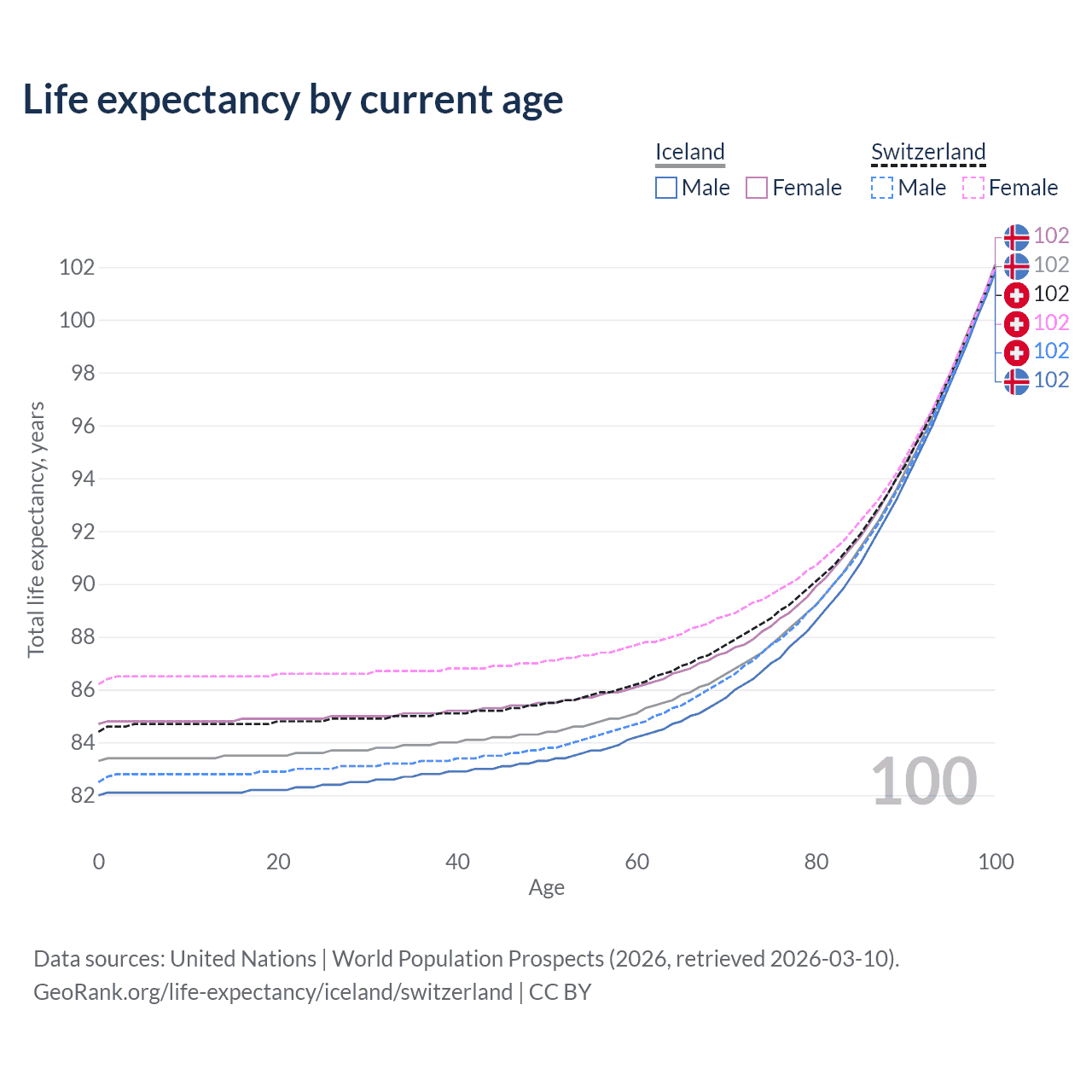 This life expectancy calculator shows the odds of living to 100, 95, 90, and below based on current age for both males and females in Iceland and Switzerland, along with mean and median age of death. The calculations are based on the 2026 life tables (actuarial tables) from the UN World Population Prospects.