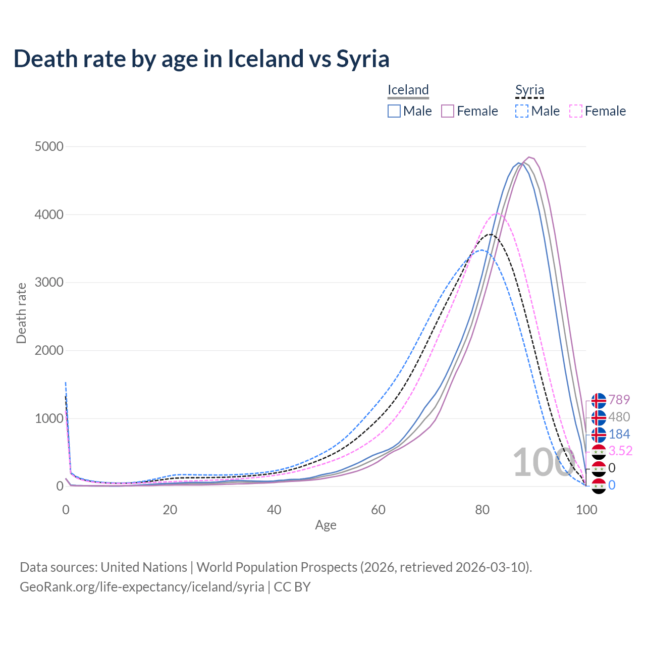 This life expectancy calculator shows the odds of living to 100, 95, 90, and below based on current age for both males and females in Iceland and Syria, along with mean and median age of death. The calculations are based on the 2026 life tables (actuarial tables) from the UN World Population Prospects.