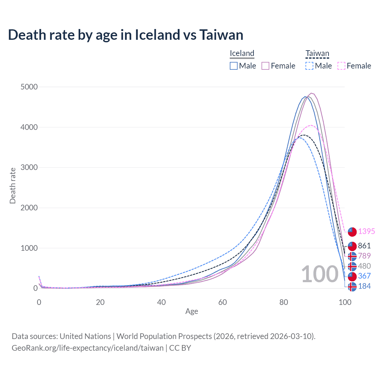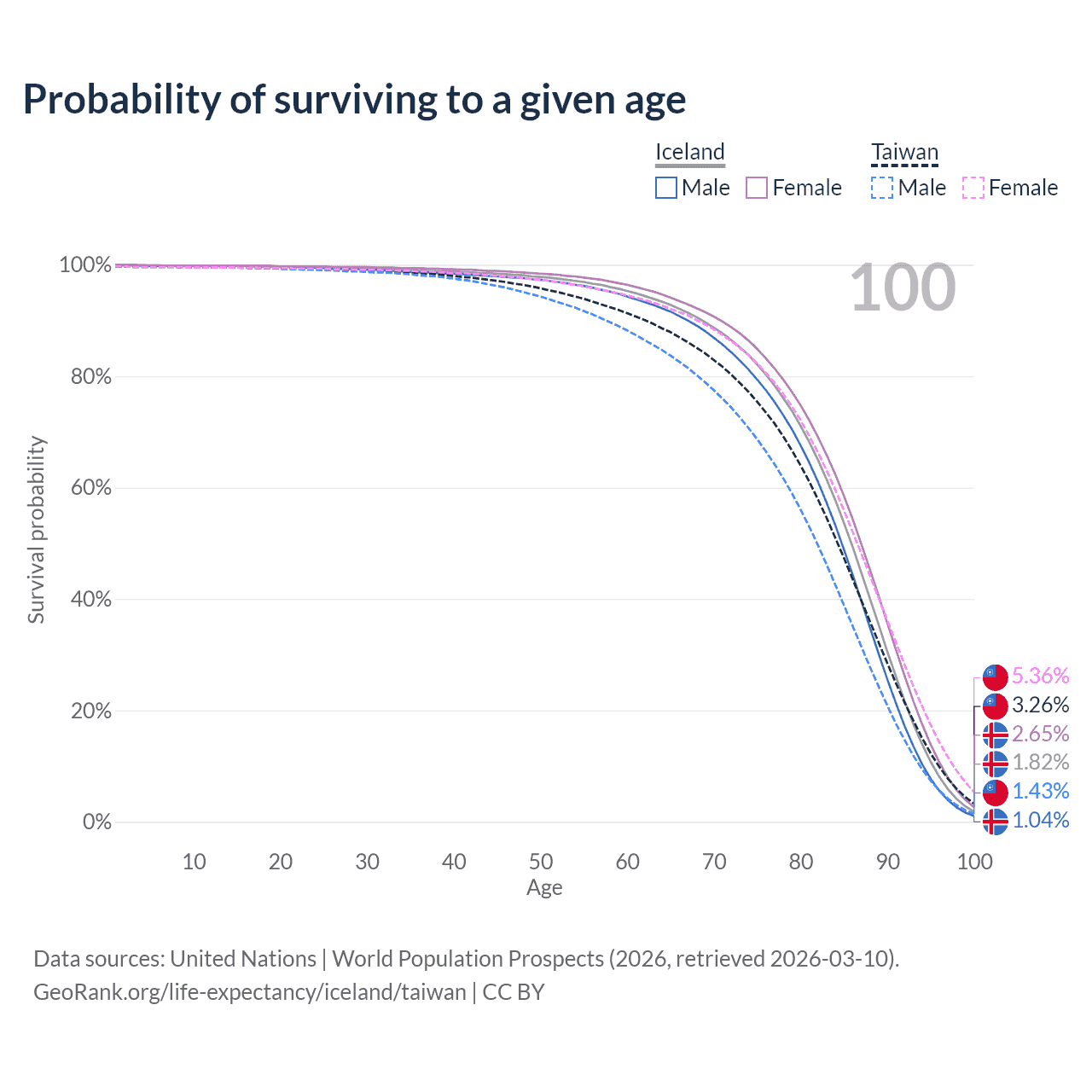 This life expectancy calculator shows the odds of living to 100, 95, 90, and below based on current age for both males and females in Iceland and Taiwan, along with mean and median age of death. The calculations are based on the 2026 life tables (actuarial tables) from the UN World Population Prospects.