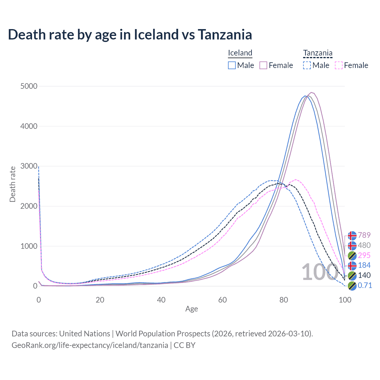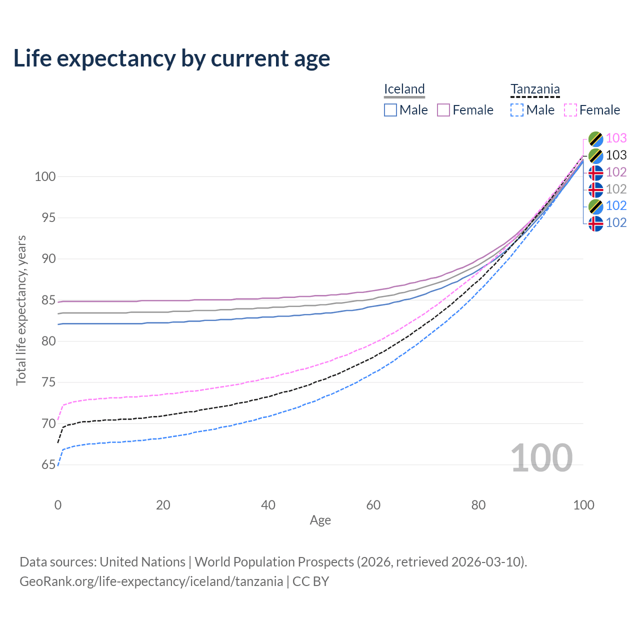 This life expectancy calculator shows the odds of living to 100, 95, 90, and below based on current age for both males and females in Iceland and Tanzania, along with mean and median age of death. The calculations are based on the 2026 life tables (actuarial tables) from the UN World Population Prospects.