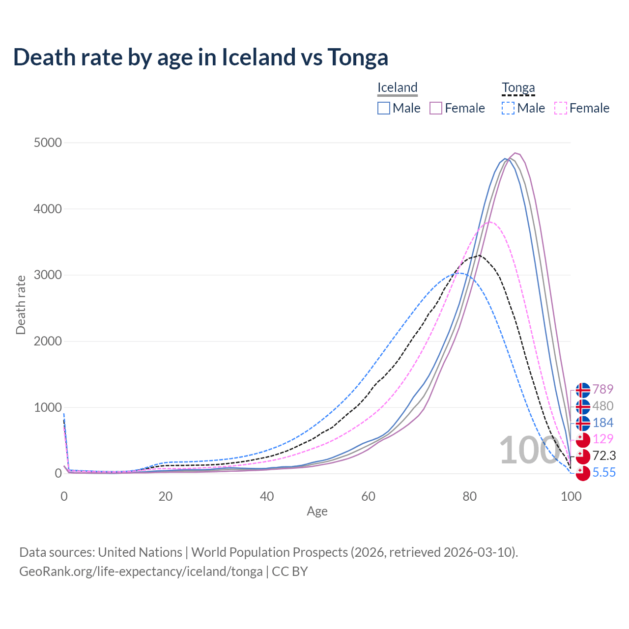 This life expectancy calculator shows the odds of living to 100, 95, 90, and below based on current age for both males and females in Iceland and Tonga, along with mean and median age of death. The calculations are based on the 2026 life tables (actuarial tables) from the UN World Population Prospects.