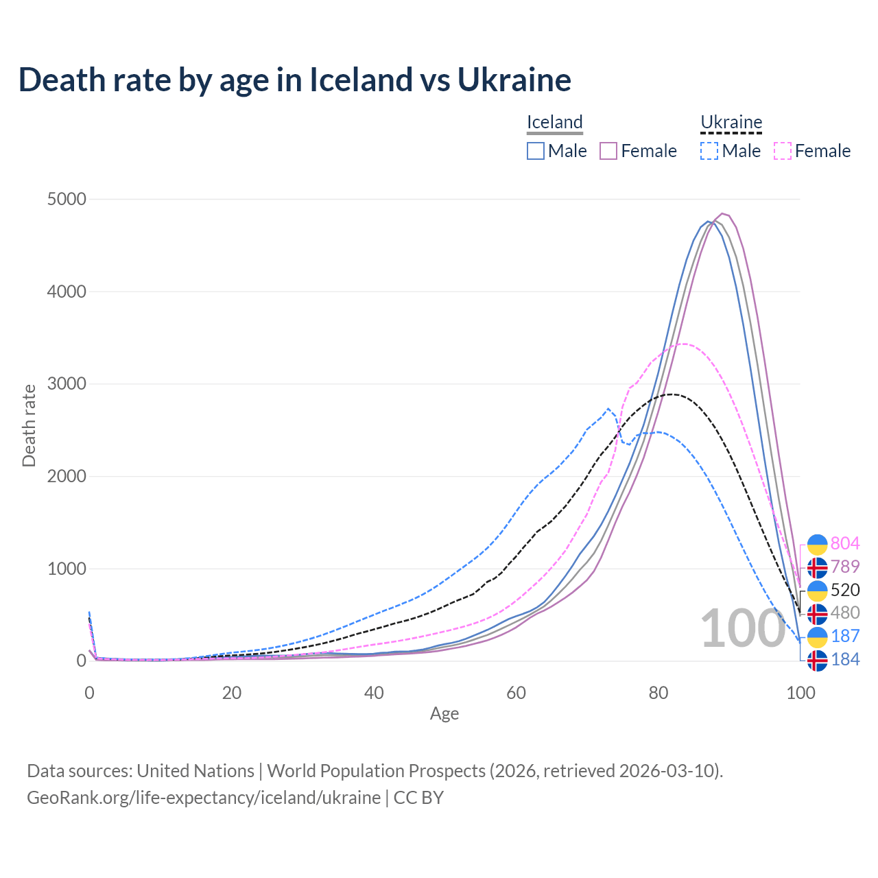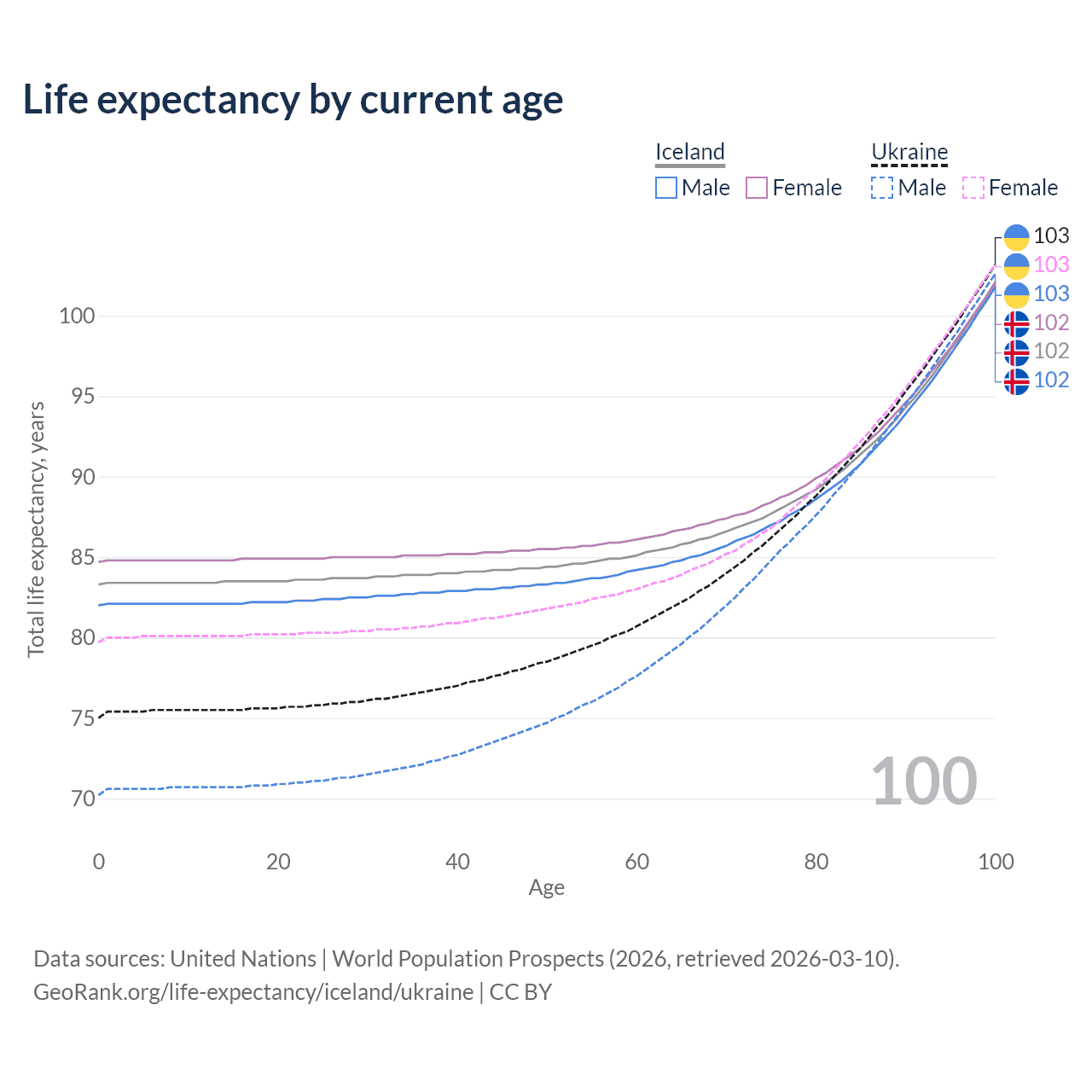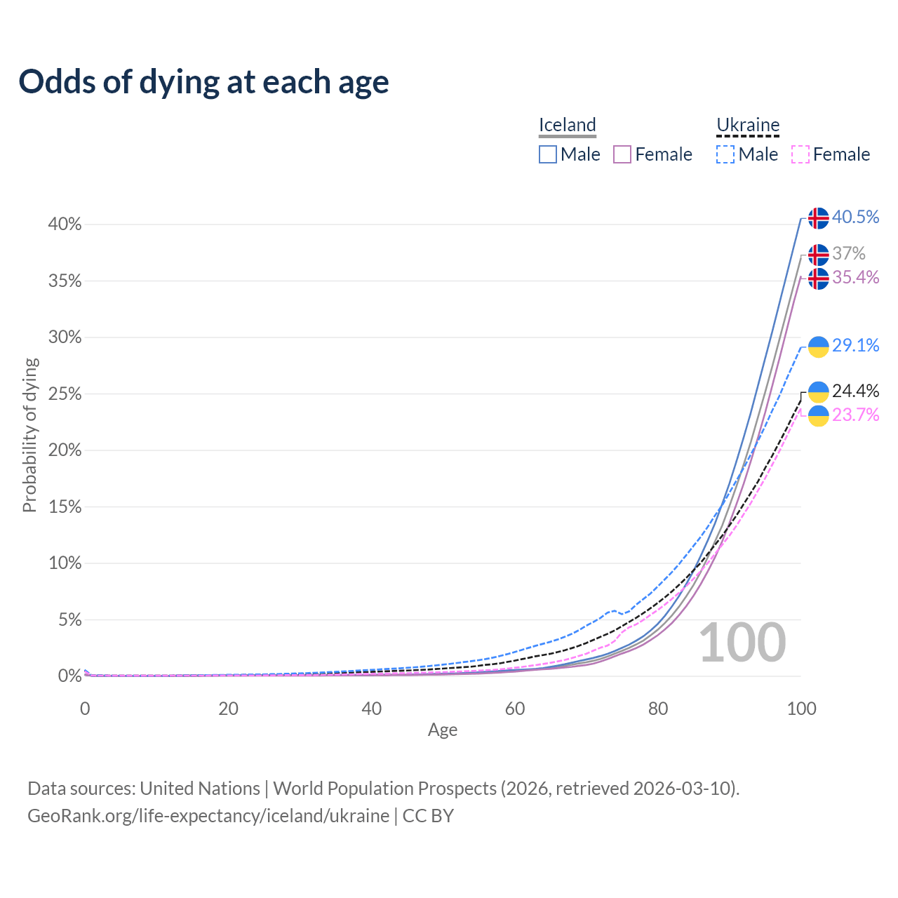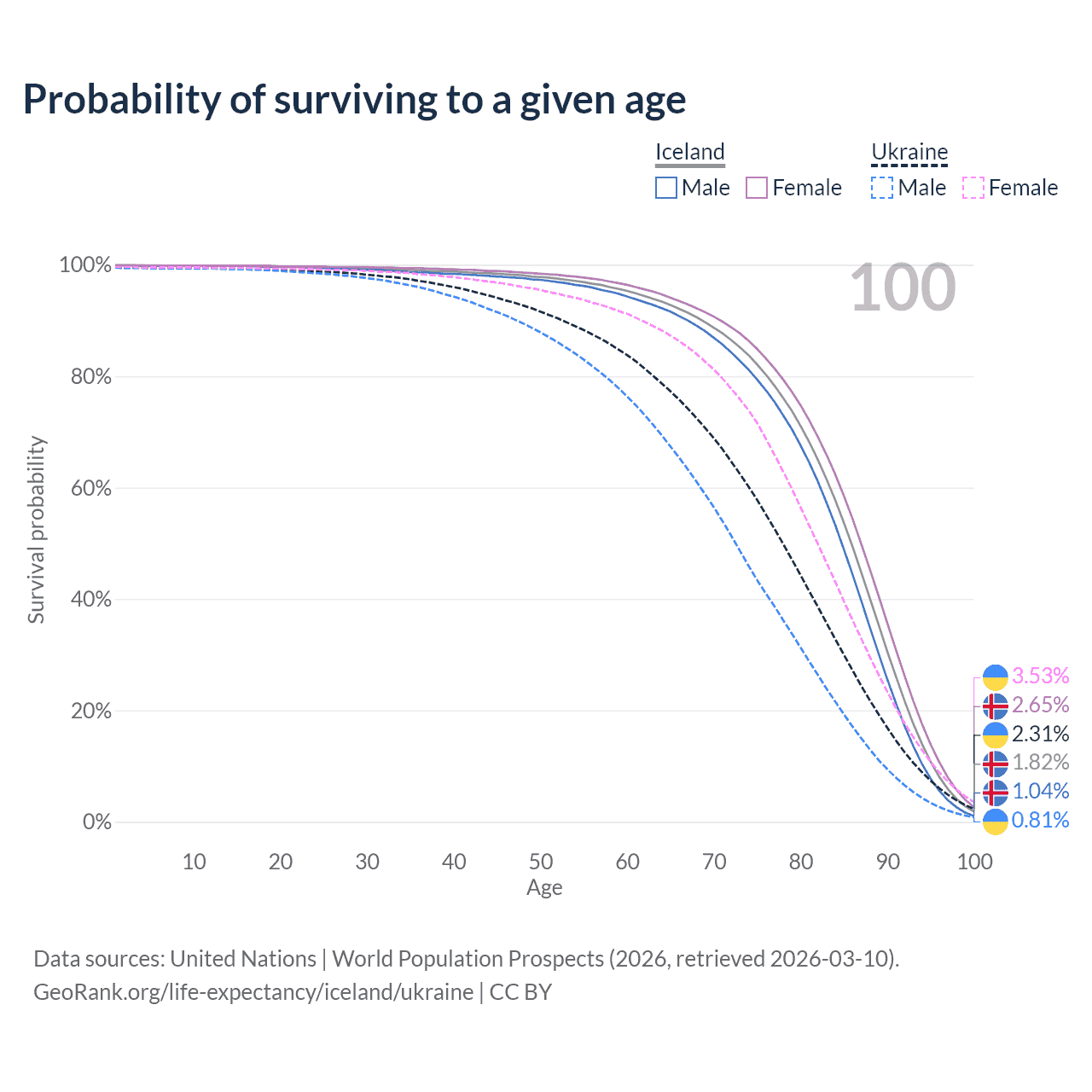 This life expectancy calculator shows the odds of living to 100, 95, 90, and below based on current age for both males and females in Iceland and Ukraine, along with mean and median age of death. The calculations are based on the 2026 life tables (actuarial tables) from the UN World Population Prospects.