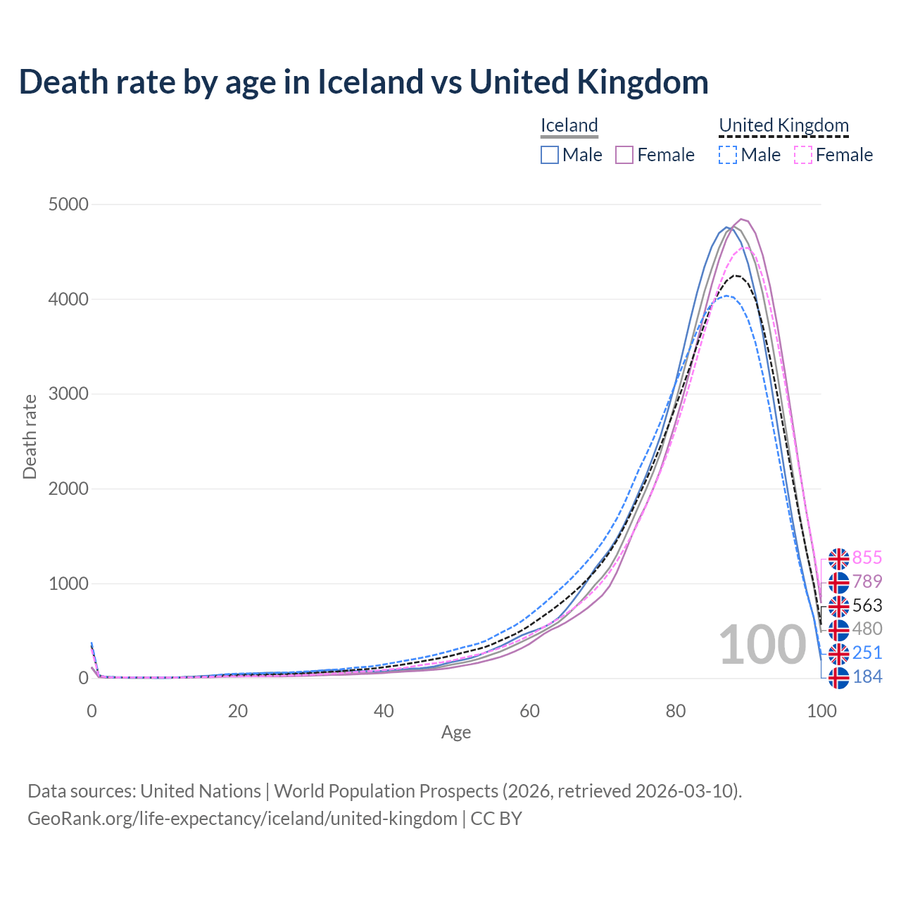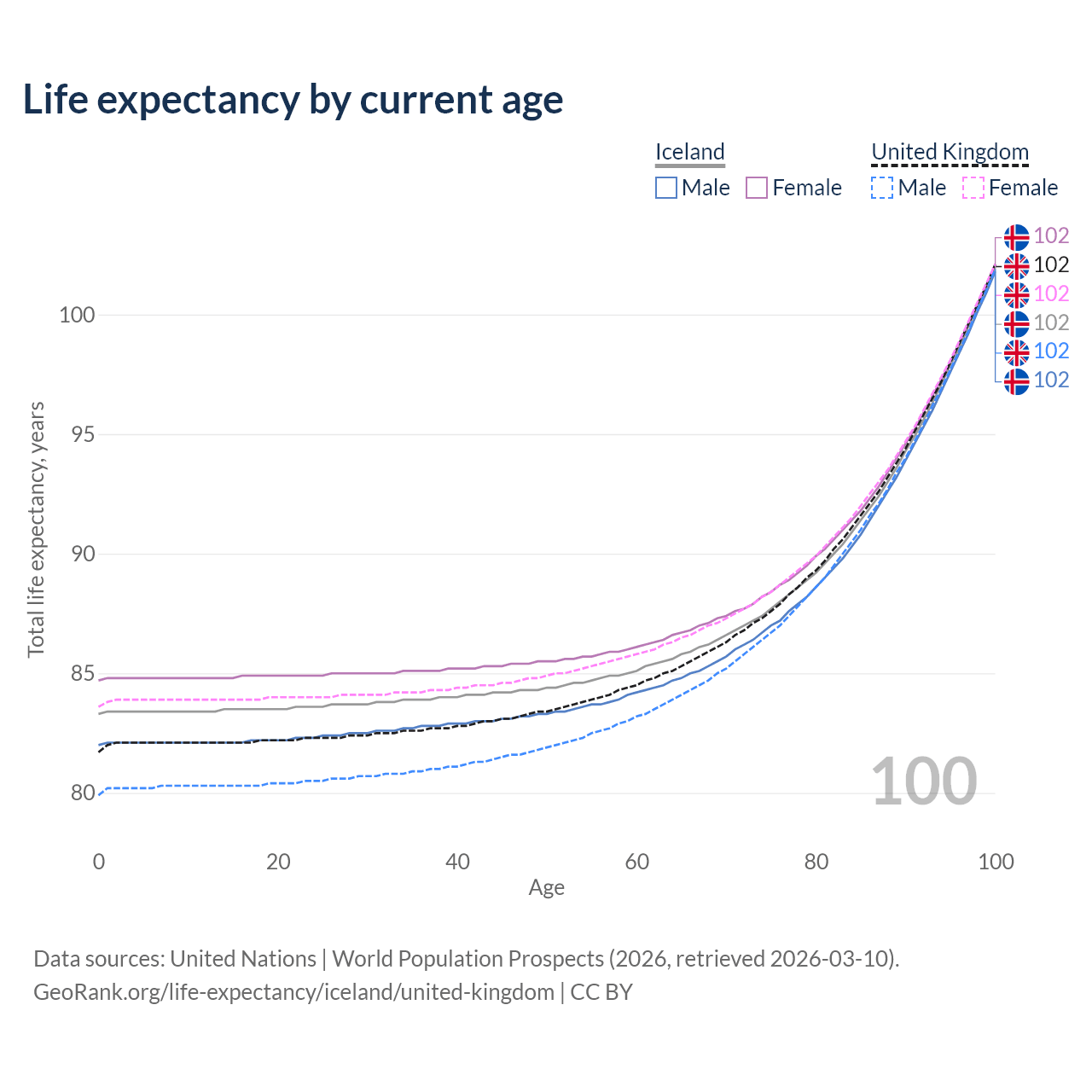 This life expectancy calculator shows the odds of living to 100, 95, 90, and below based on current age for both males and females in Iceland and the United Kingdom, along with mean and median age of death. The calculations are based on the 2026 life tables (actuarial tables) from the UN World Population Prospects.