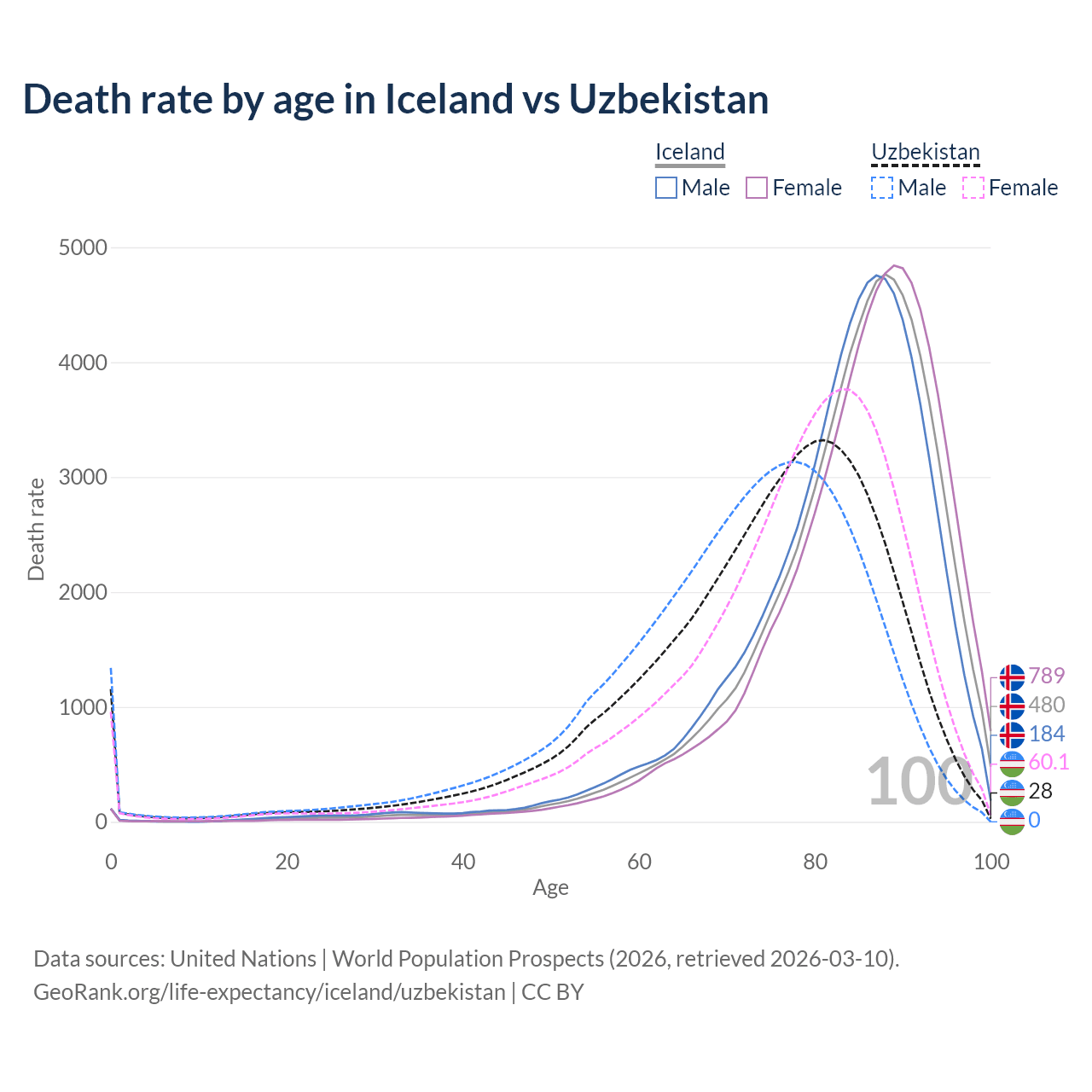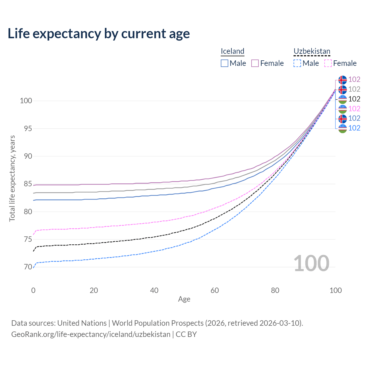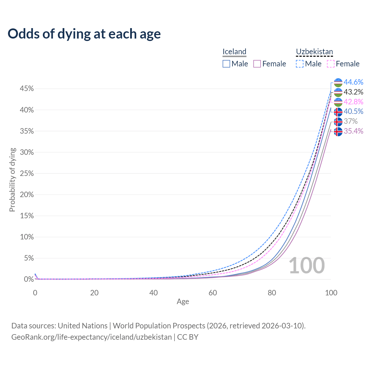 This life expectancy calculator shows the odds of living to 100, 95, 90, and below based on current age for both males and females in Iceland and Uzbekistan, along with mean and median age of death. The calculations are based on the 2026 life tables (actuarial tables) from the UN World Population Prospects.