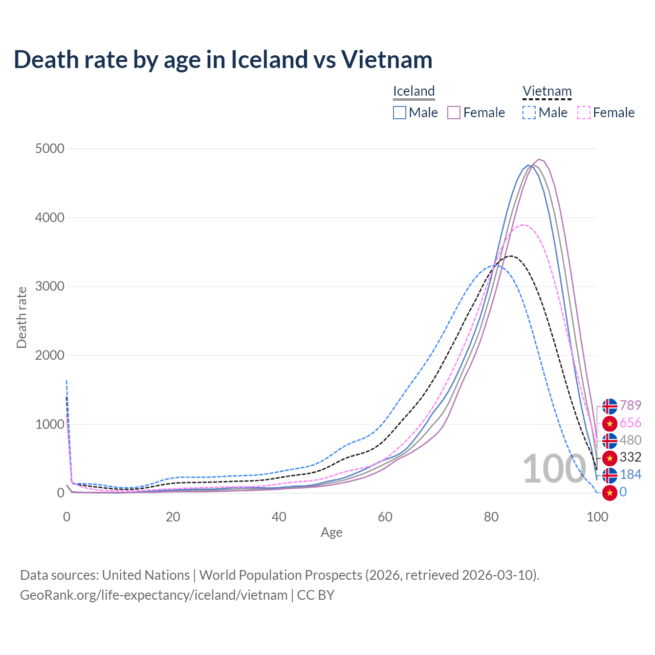 This life expectancy calculator shows the odds of living to 100, 95, 90, and below based on current age for both males and females in Iceland and Vietnam, along with mean and median age of death. The calculations are based on the 2026 life tables (actuarial tables) from the UN World Population Prospects.