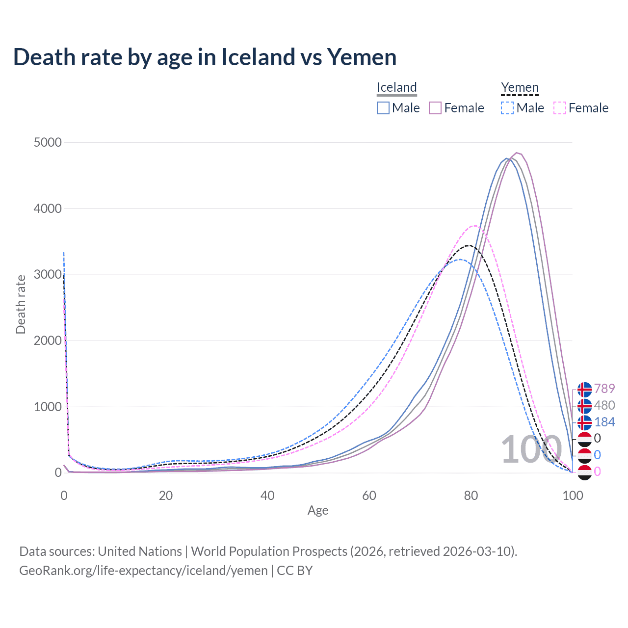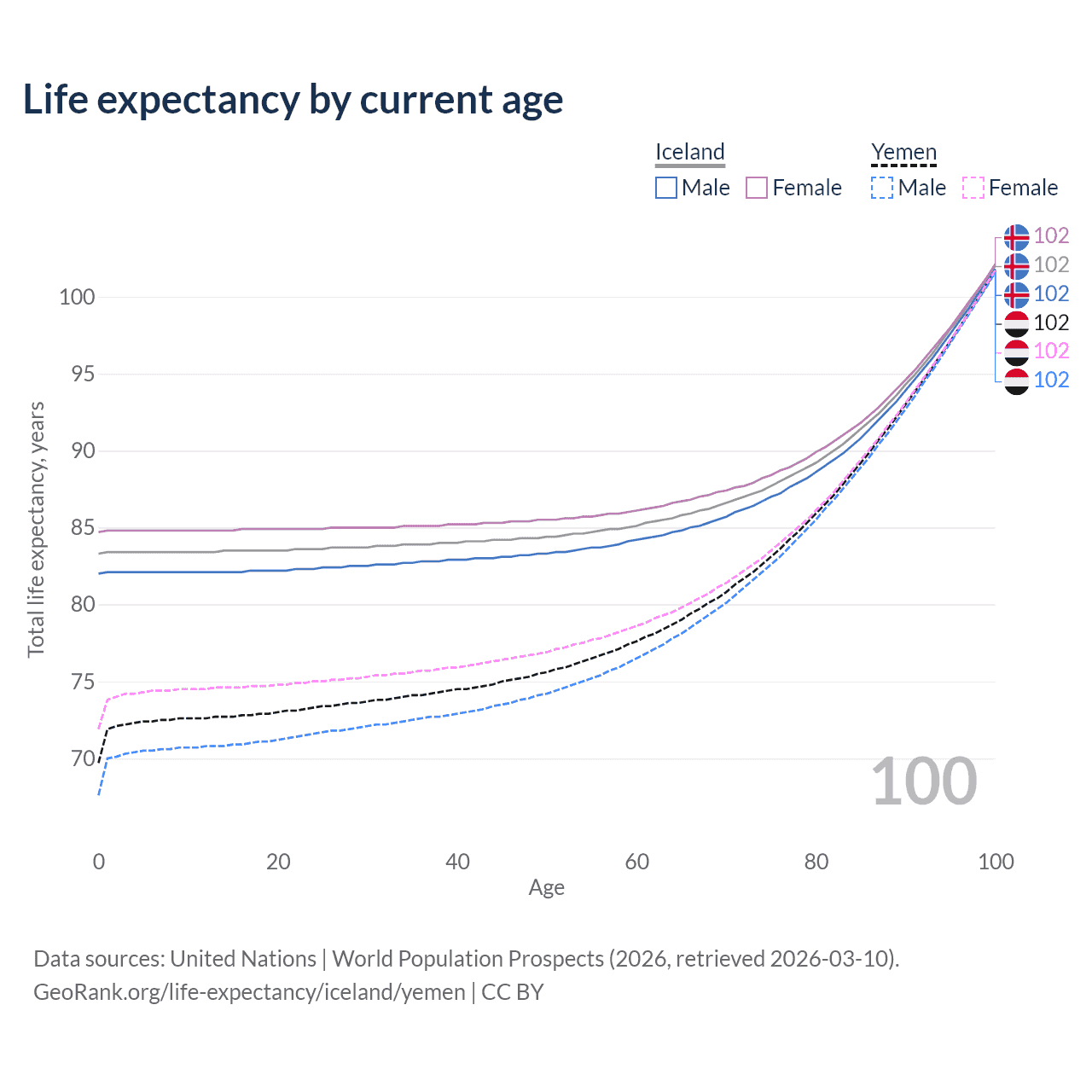 This life expectancy calculator shows the odds of living to 100, 95, 90, and below based on current age for both males and females in Iceland and Yemen, along with mean and median age of death. The calculations are based on the 2026 life tables (actuarial tables) from the UN World Population Prospects.