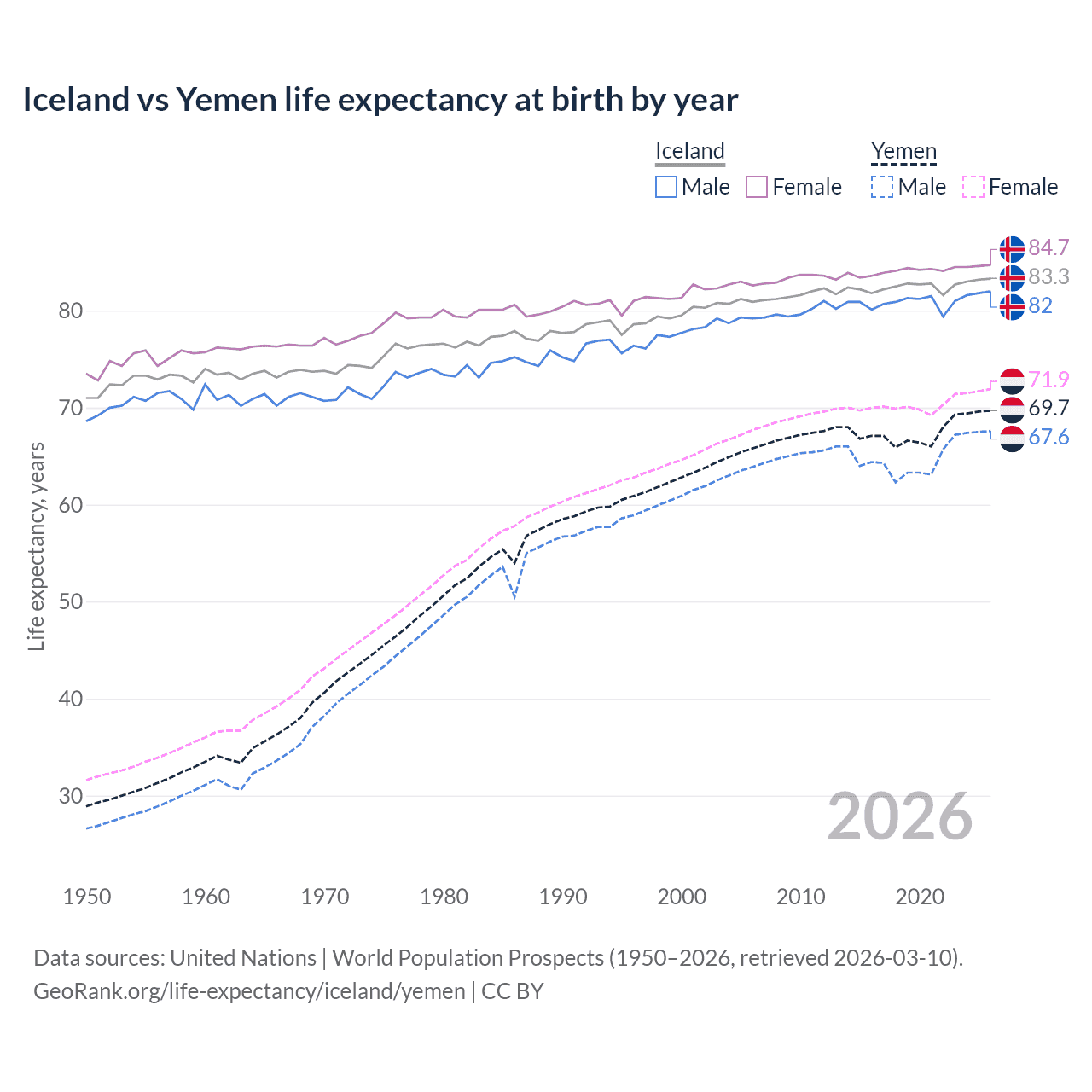 Iceland vs Yemen life expectancy at birth by year