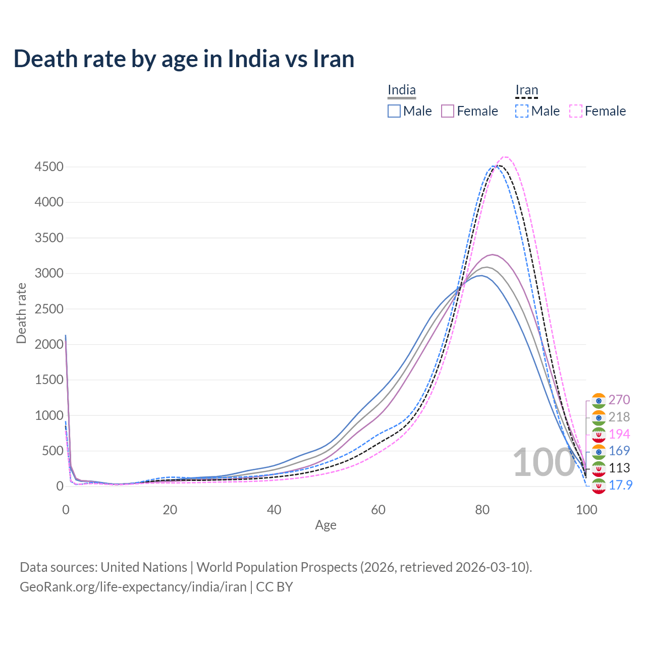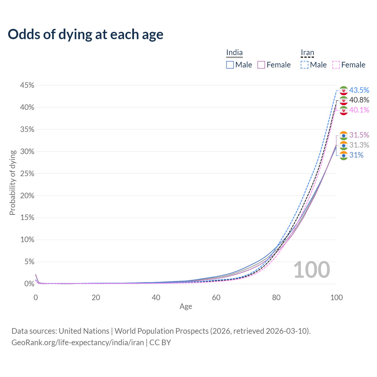 This life expectancy calculator shows the odds of living to 100, 95, 90, and below based on current age for both males and females in India and Iran, along with mean and median age of death. The calculations are based on the 2026 life tables (actuarial tables) from the UN World Population Prospects.