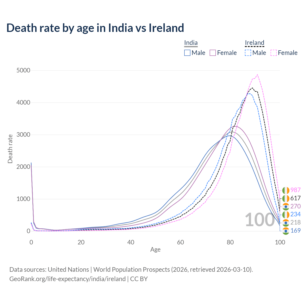 In India, the most common age of death is 81, compared to 89 in Ireland. The median age of death is 76.8 in India and 85.7 in Ireland, meaning only half of each cohort is expected to live past that age.