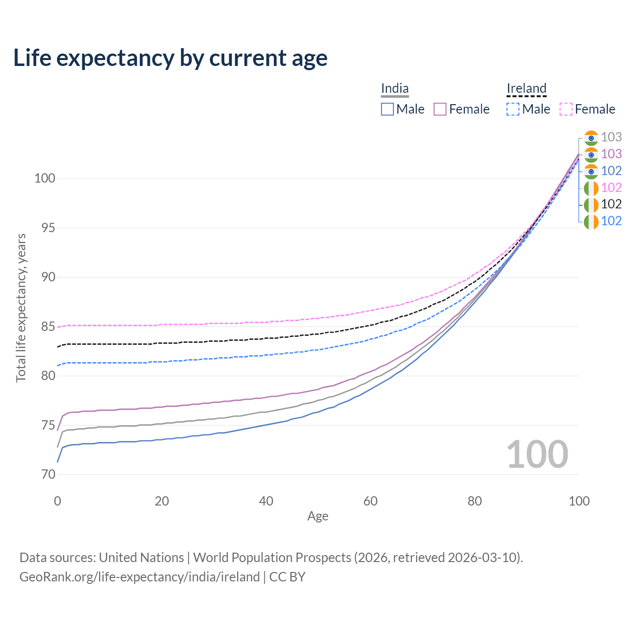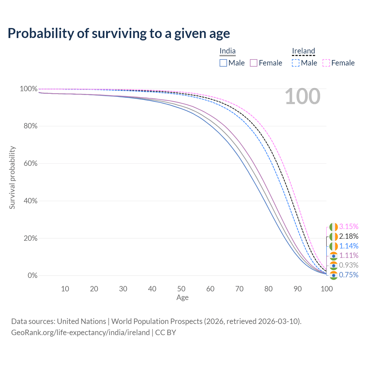 This life expectancy calculator shows the odds of living to 100, 95, 90, and below based on current age for both males and females in India and Ireland, along with mean and median age of death. The calculations are based on the 2026 life tables (actuarial tables) from the UN World Population Prospects.