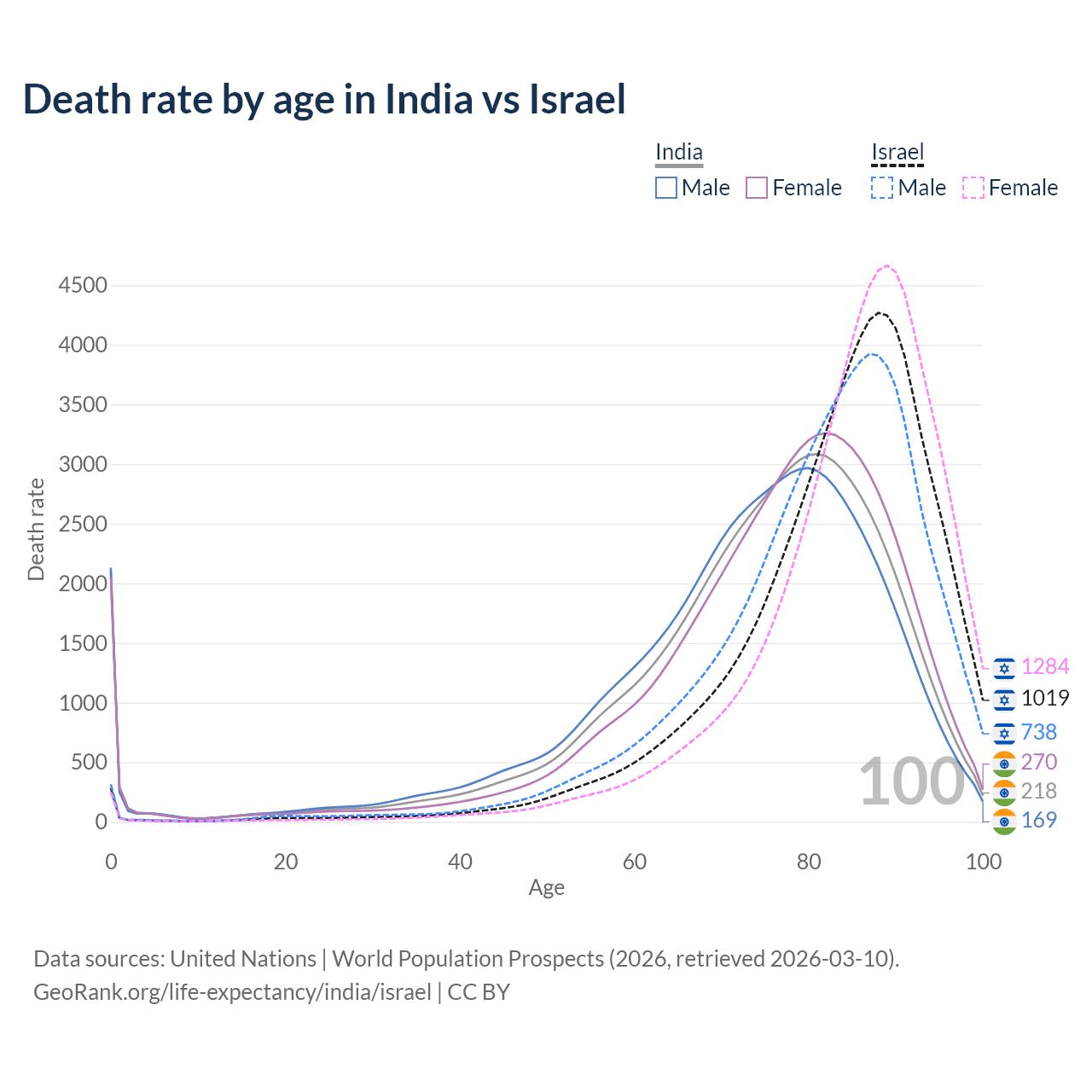 In India, the most common age of death is 81, compared to 88 in Israel. The median age of death is 76.8 in India and 85.6 in Israel, meaning only half of each cohort is expected to live past that age.