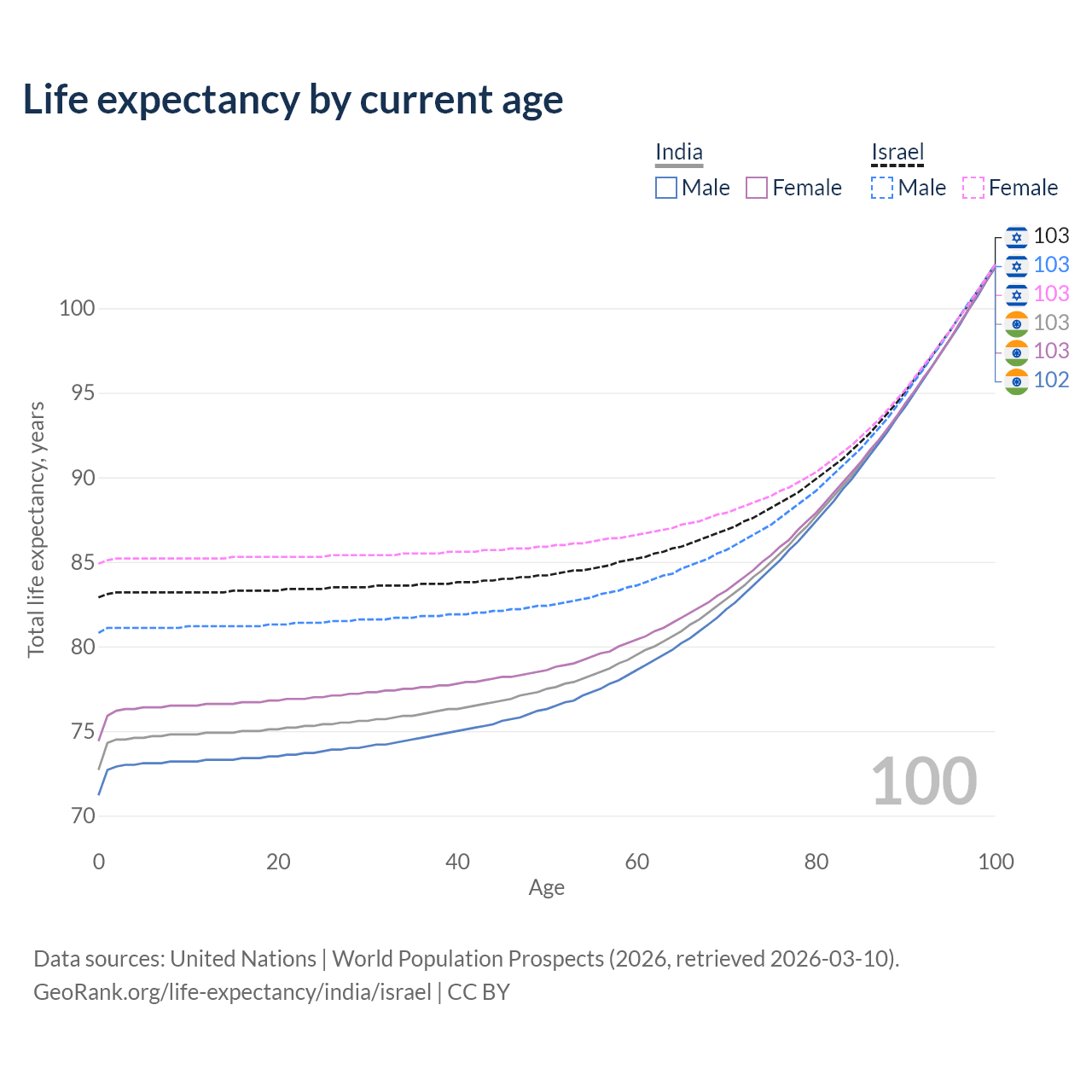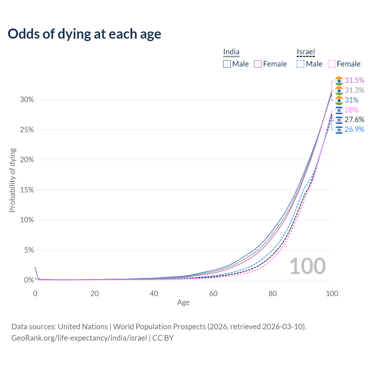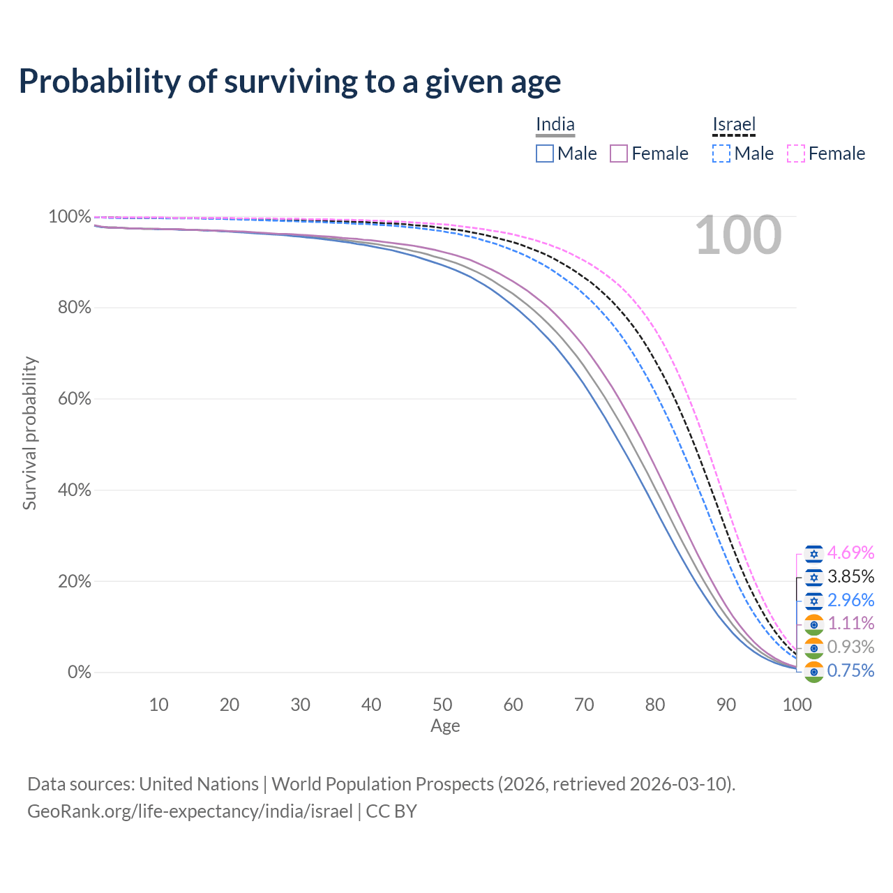 This life expectancy calculator shows the odds of living to 100, 95, 90, and below based on current age for both males and females in India and Israel, along with mean and median age of death. The calculations are based on the 2026 life tables (actuarial tables) from the UN World Population Prospects.