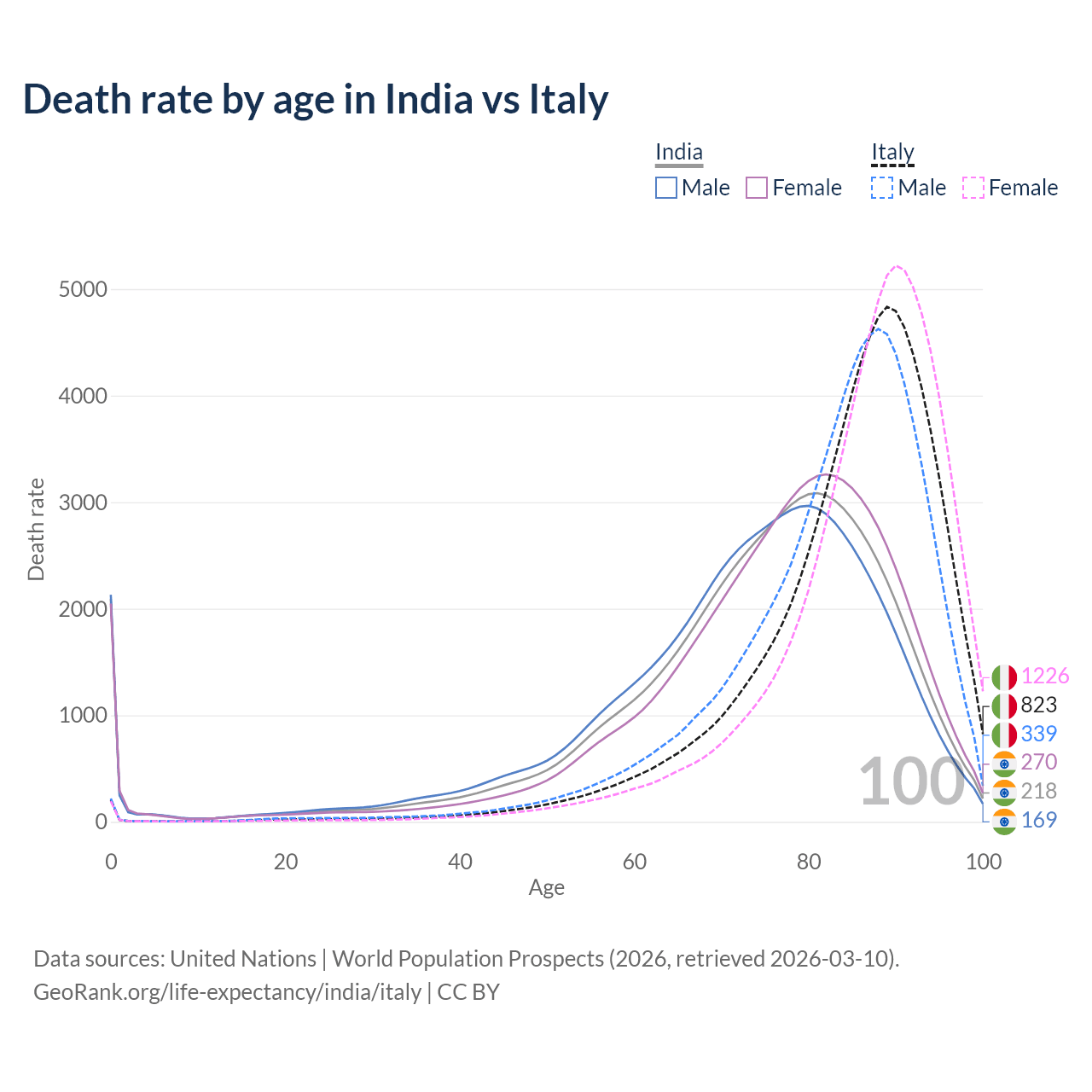 In India, the most common age of death is 81, compared to 89 in Italy. The median age of death is 76.8 in India and 86.9 in Italy, meaning only half of each cohort is expected to live past that age.