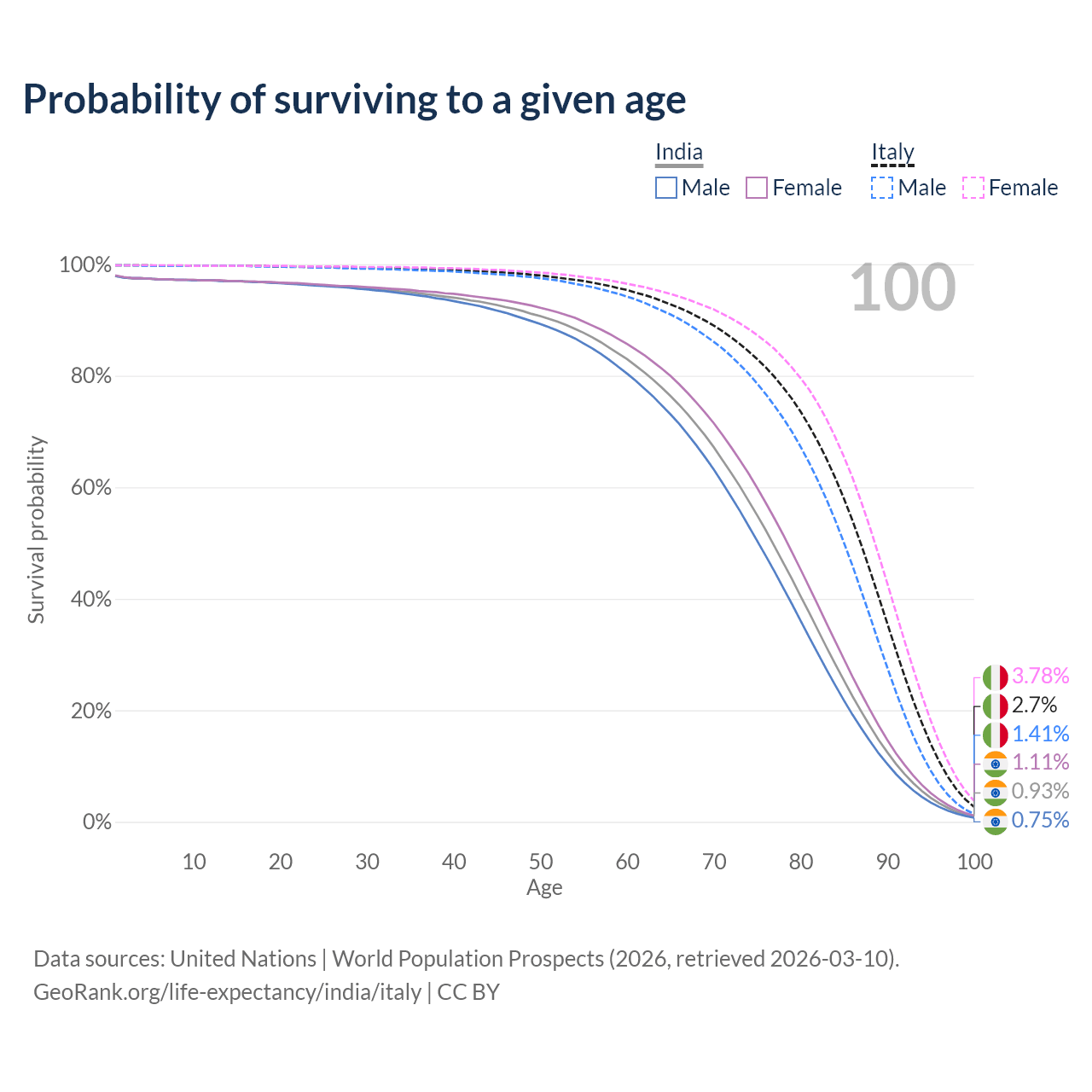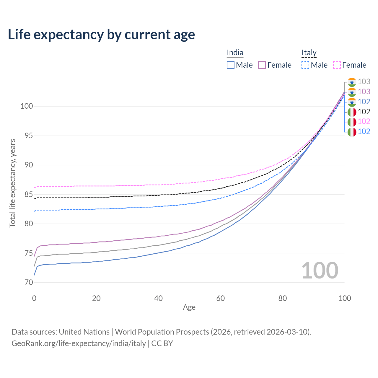 This life expectancy calculator shows the odds of living to 100, 95, 90, and below based on current age for both males and females in India and Italy, along with mean and median age of death. The calculations are based on the 2026 life tables (actuarial tables) from the UN World Population Prospects.