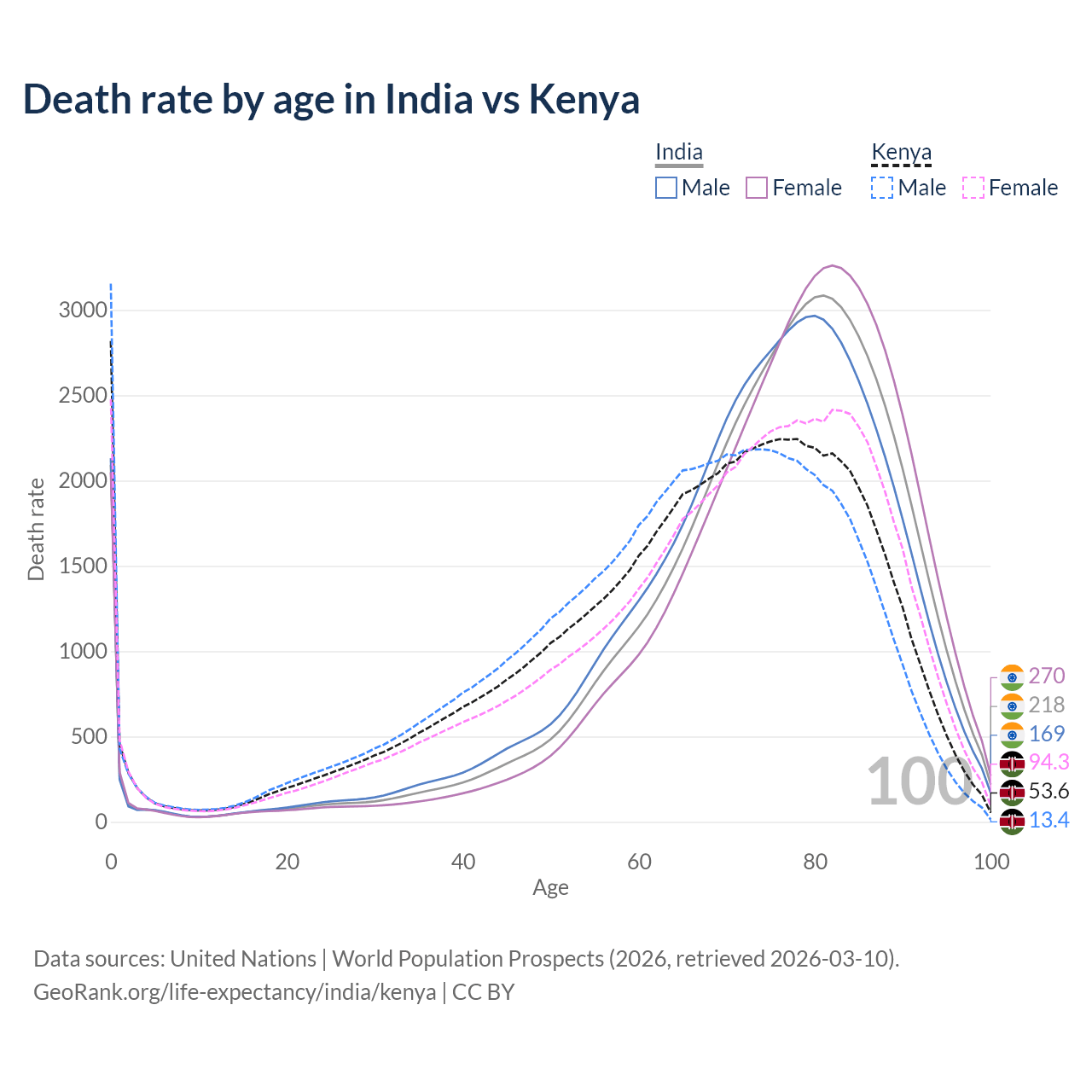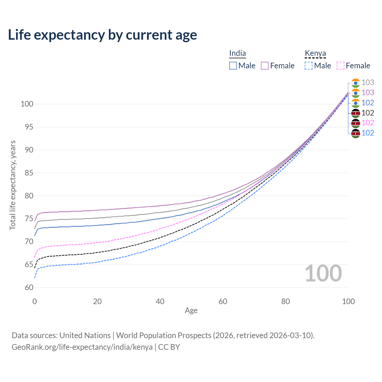 This life expectancy calculator shows the odds of living to 100, 95, 90, and below based on current age for both males and females in India and Kenya, along with mean and median age of death. The calculations are based on the 2026 life tables (actuarial tables) from the UN World Population Prospects.