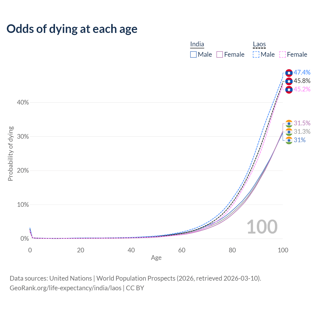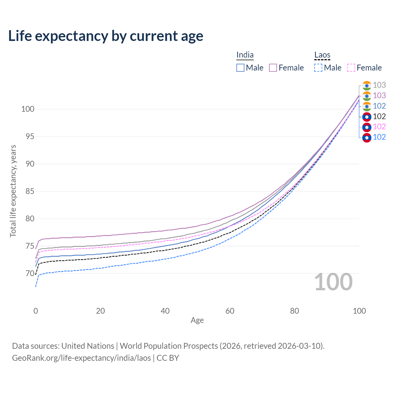 This life expectancy calculator shows the odds of living to 100, 95, 90, and below based on current age for both males and females in India and Laos, along with mean and median age of death. The calculations are based on the 2026 life tables (actuarial tables) from the UN World Population Prospects.