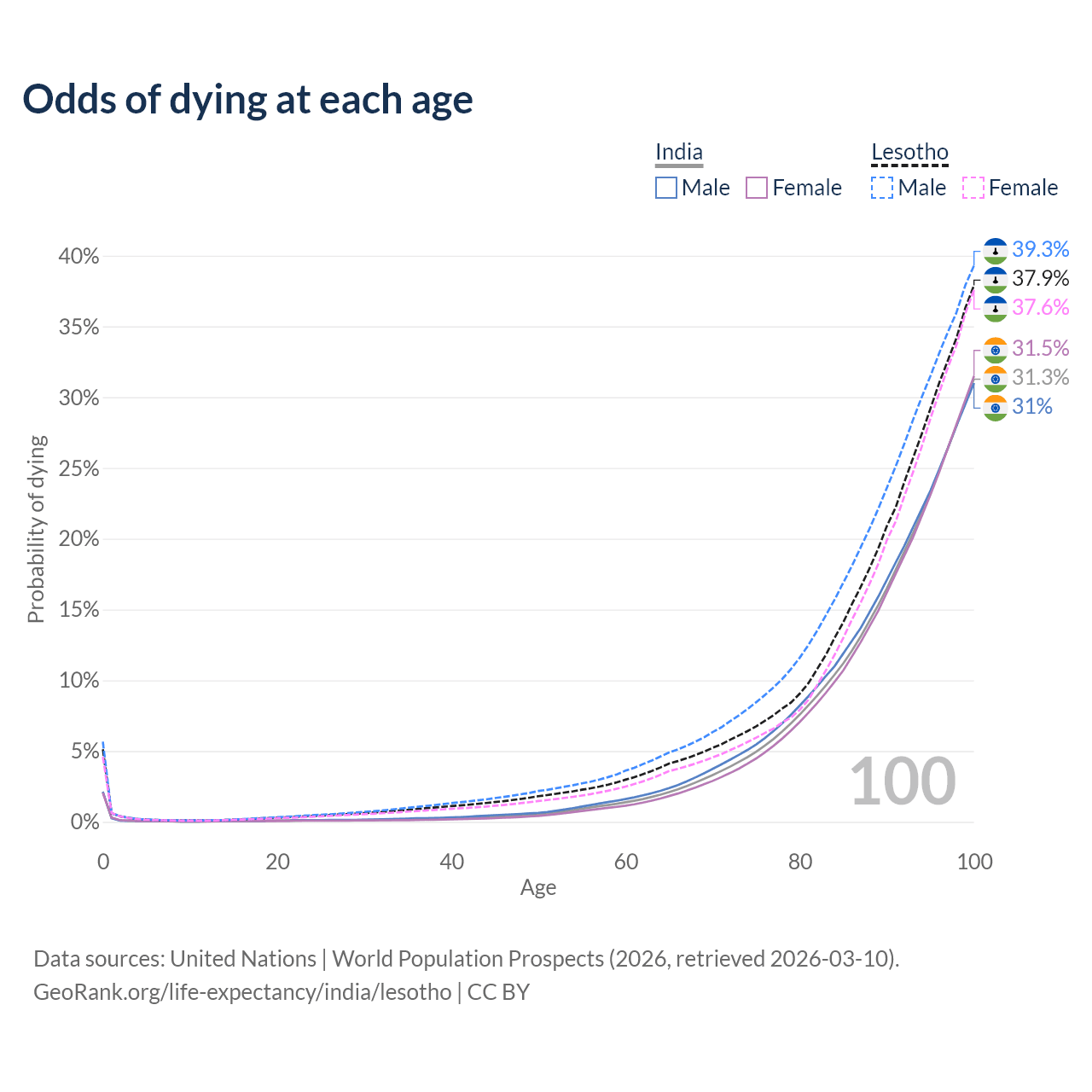 This life expectancy calculator shows the odds of living to 100, 95, 90, and below based on current age for both males and females in India and Lesotho, along with mean and median age of death. The calculations are based on the 2026 life tables (actuarial tables) from the UN World Population Prospects.