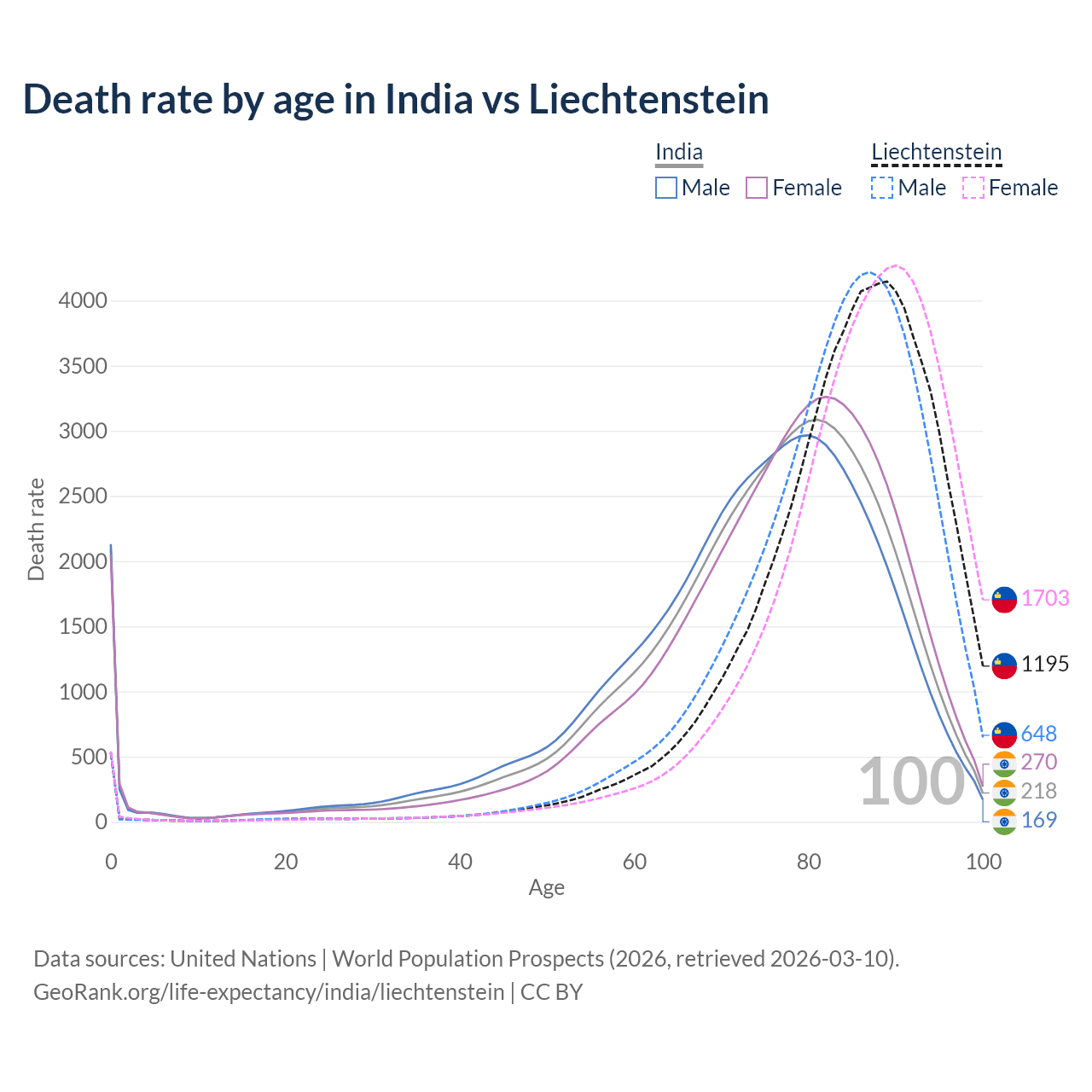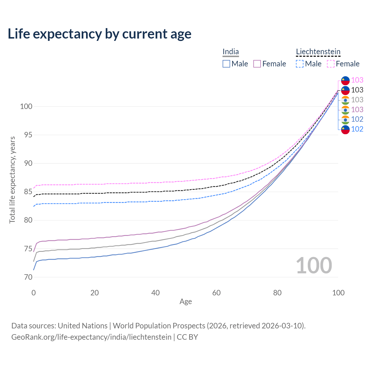This life expectancy calculator shows the odds of living to 100, 95, 90, and below based on current age for both males and females in India and Liechtenstein, along with mean and median age of death. The calculations are based on the 2026 life tables (actuarial tables) from the UN World Population Prospects.