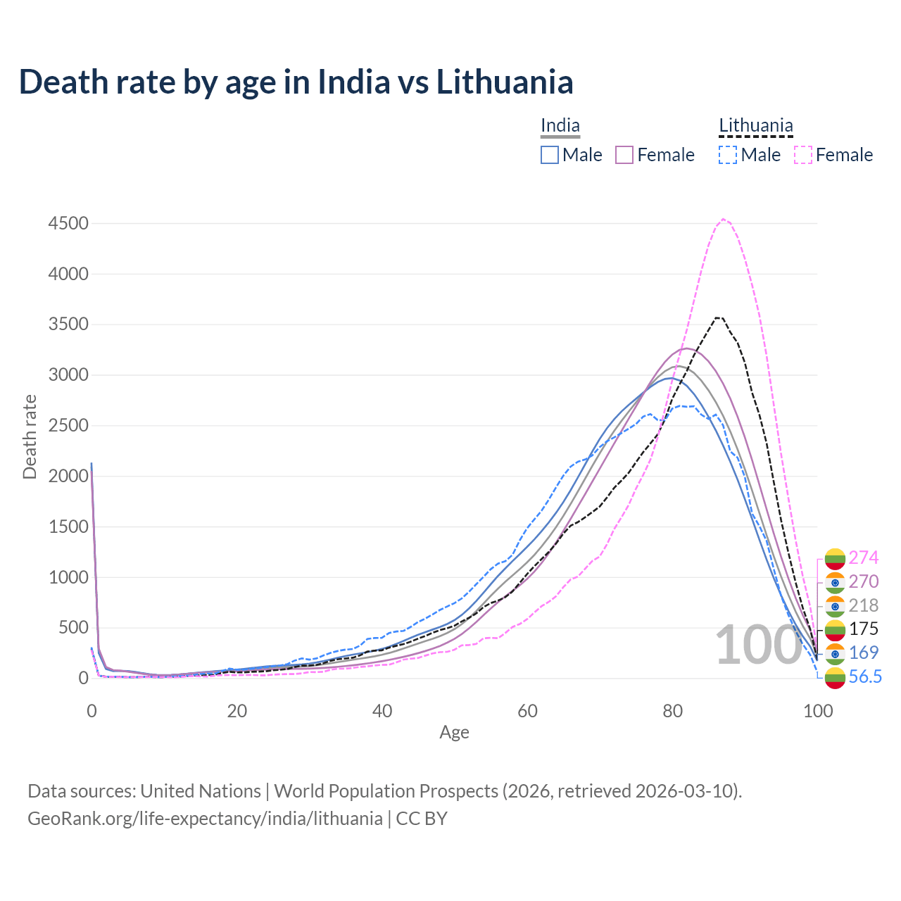 In India, the most common age of death is 81, compared to 86 in Lithuania. The median age of death is 76.8 in India and 80.4 in Lithuania, meaning only half of each cohort is expected to live past that age.