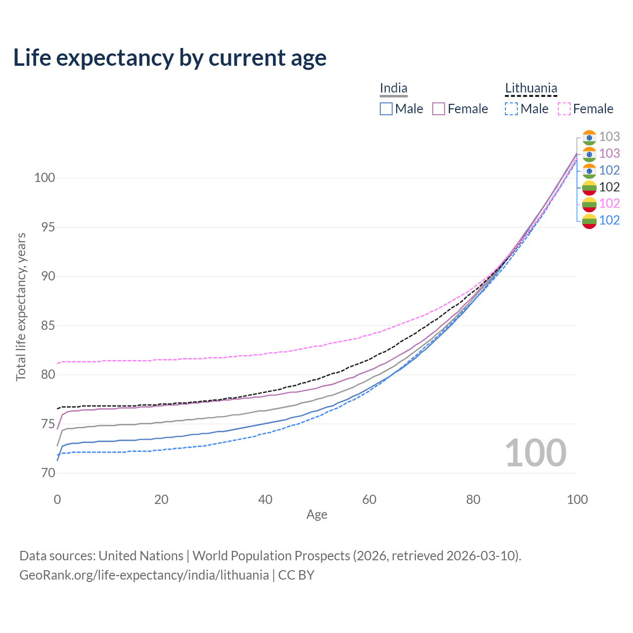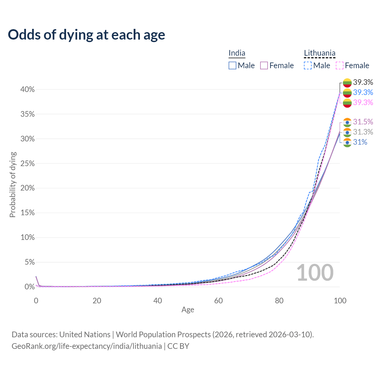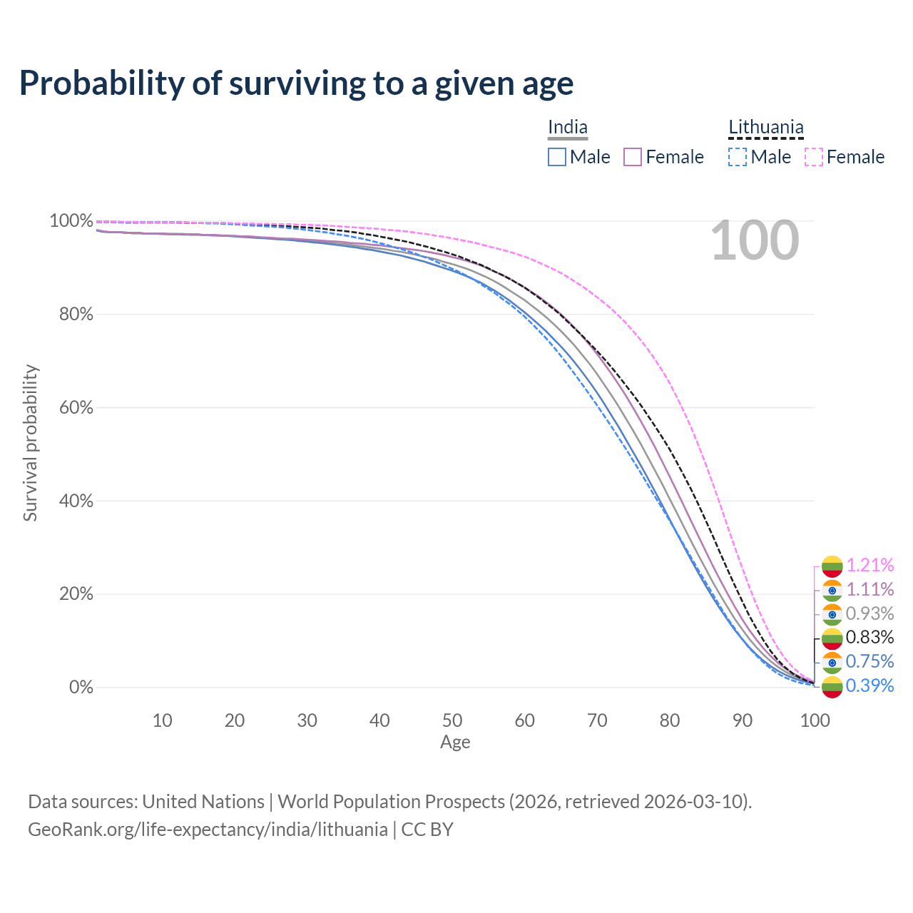 This life expectancy calculator shows the odds of living to 100, 95, 90, and below based on current age for both males and females in India and Lithuania, along with mean and median age of death. The calculations are based on the 2026 life tables (actuarial tables) from the UN World Population Prospects.