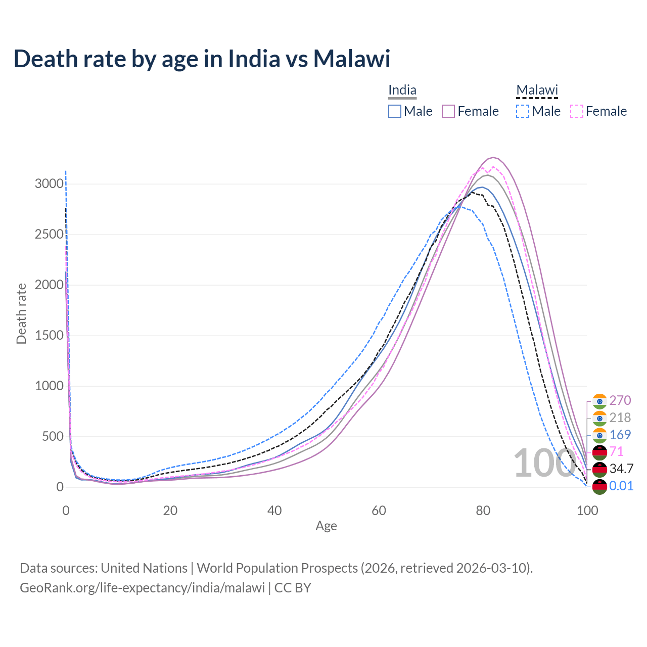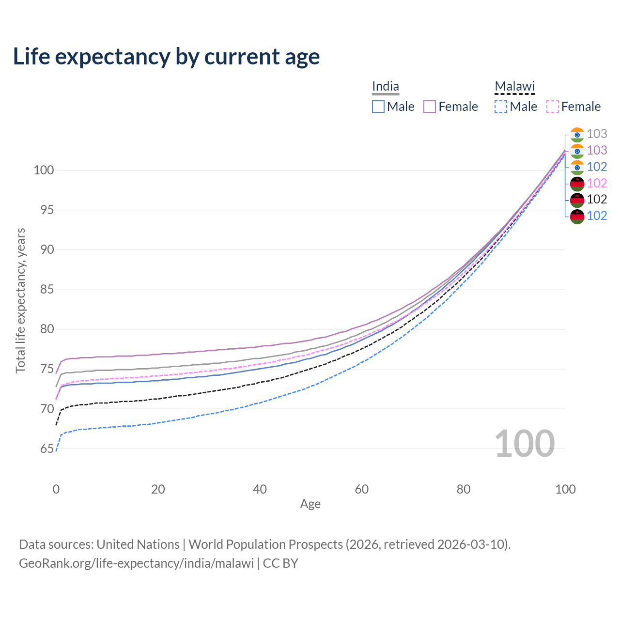 This life expectancy calculator shows the odds of living to 100, 95, 90, and below based on current age for both males and females in India and Malawi, along with mean and median age of death. The calculations are based on the 2026 life tables (actuarial tables) from the UN World Population Prospects.