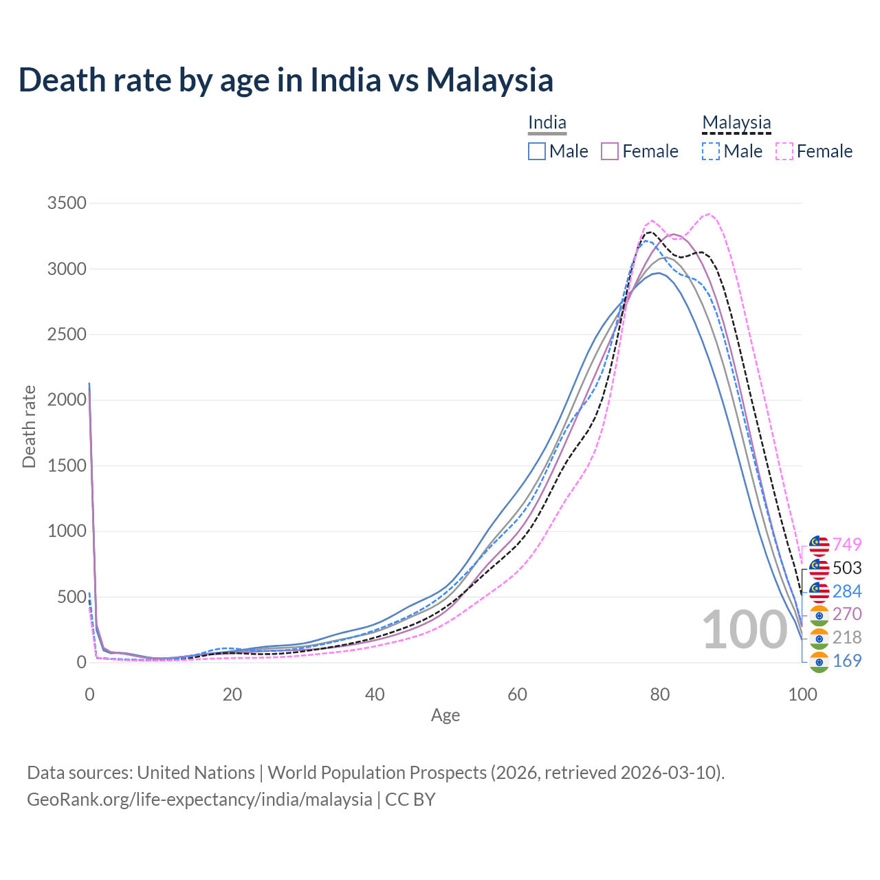 In India, the most common age of death is 81, compared to 79 in Malaysia. The median age of death is 76.8 in India and 79.8 in Malaysia, meaning only half of each cohort is expected to live past that age.