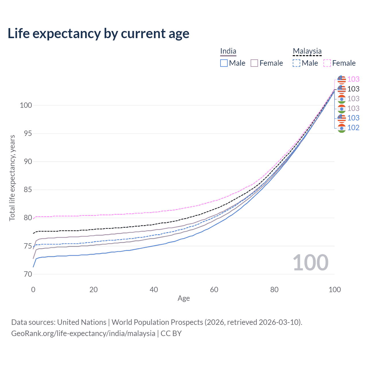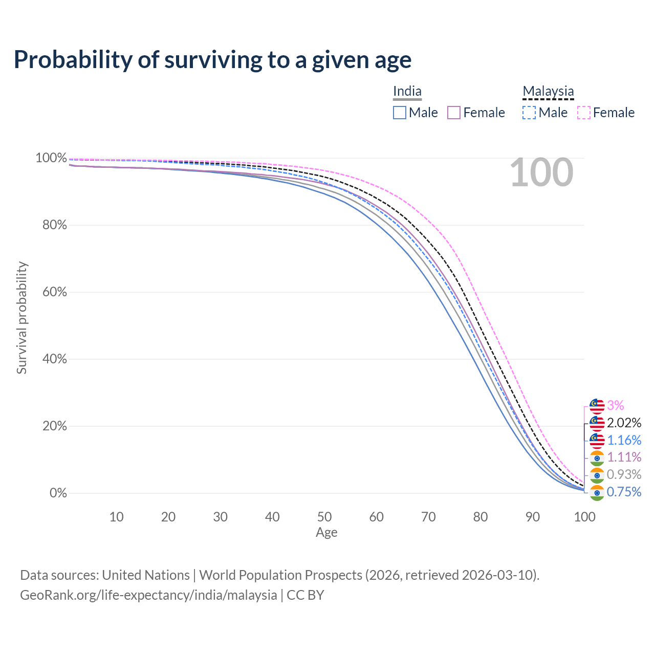 This life expectancy calculator shows the odds of living to 100, 95, 90, and below based on current age for both males and females in India and Malaysia, along with mean and median age of death. The calculations are based on the 2026 life tables (actuarial tables) from the UN World Population Prospects.