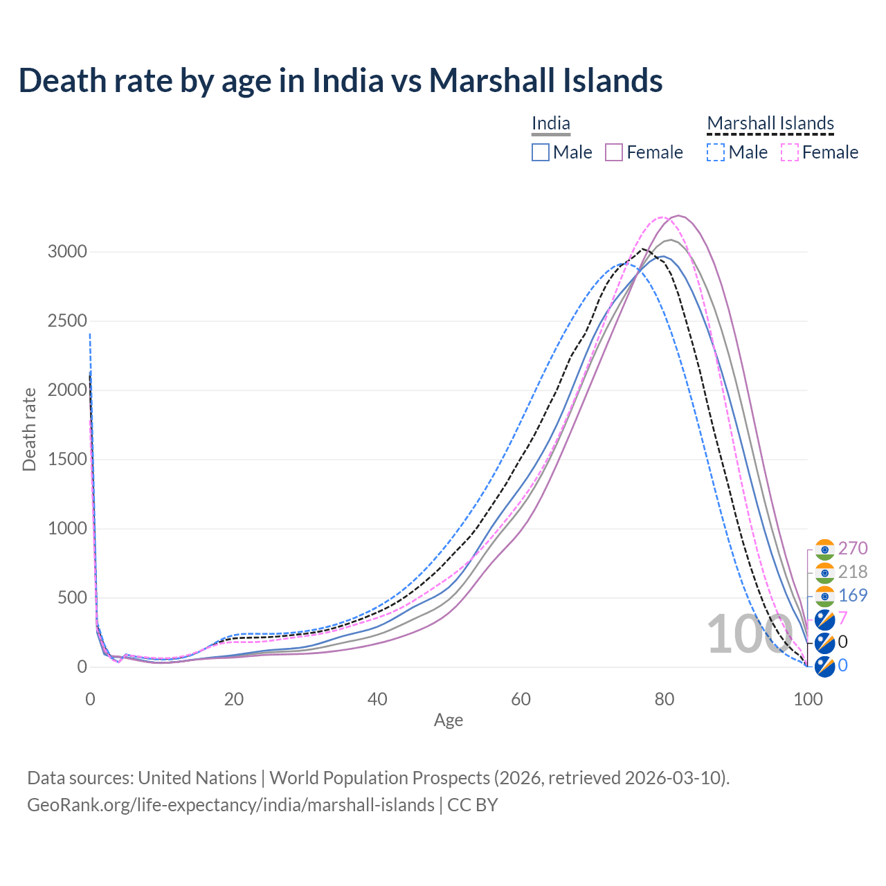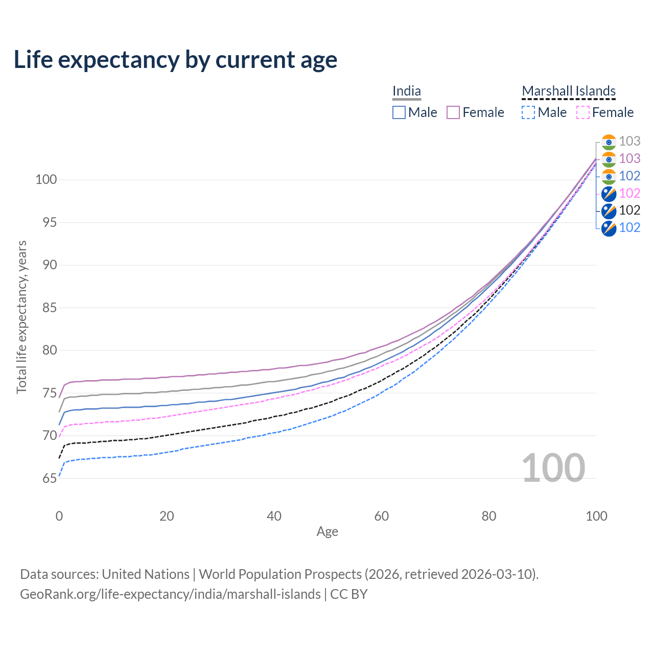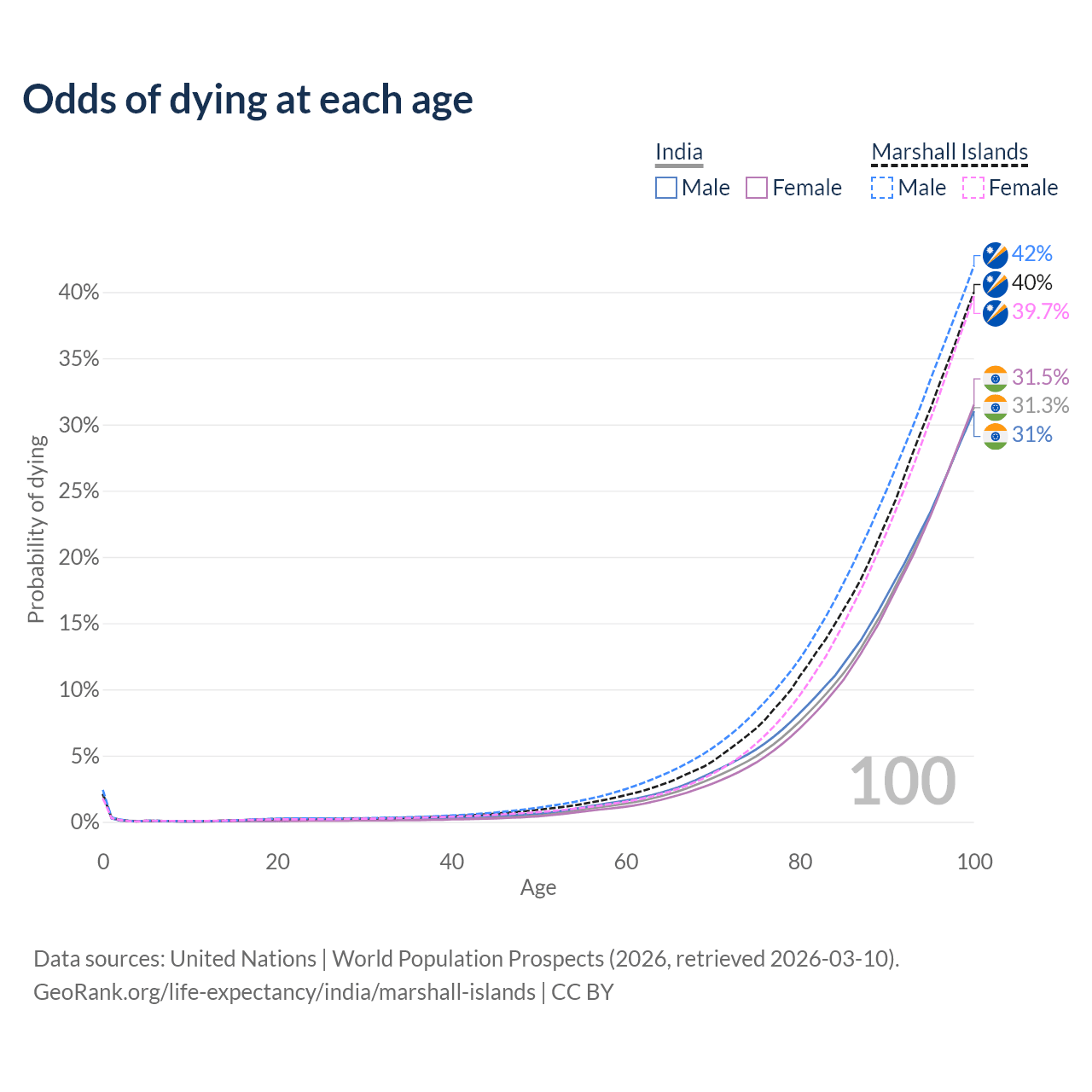 This life expectancy calculator shows the odds of living to 100, 95, 90, and below based on current age for both males and females in India and the Marshall Islands, along with mean and median age of death. The calculations are based on the 2026 life tables (actuarial tables) from the UN World Population Prospects.