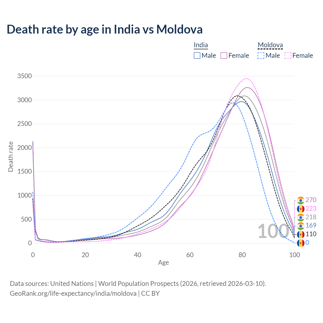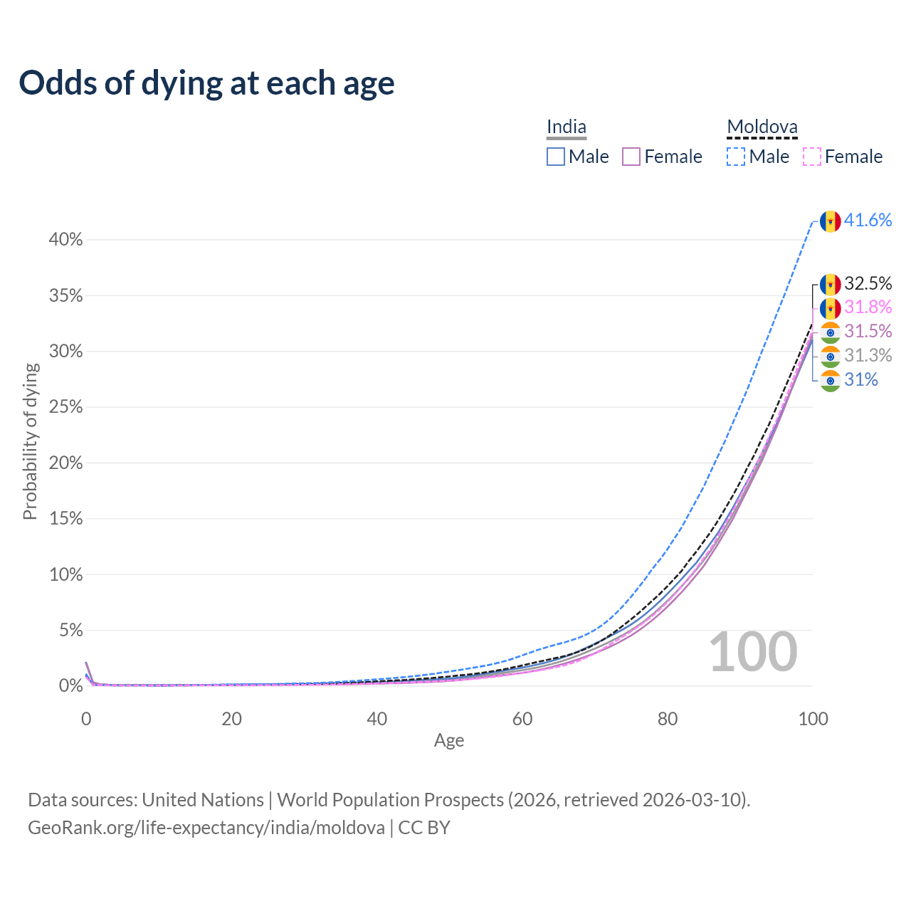 This life expectancy calculator shows the odds of living to 100, 95, 90, and below based on current age for both males and females in India and Moldova, along with mean and median age of death. The calculations are based on the 2026 life tables (actuarial tables) from the UN World Population Prospects.
