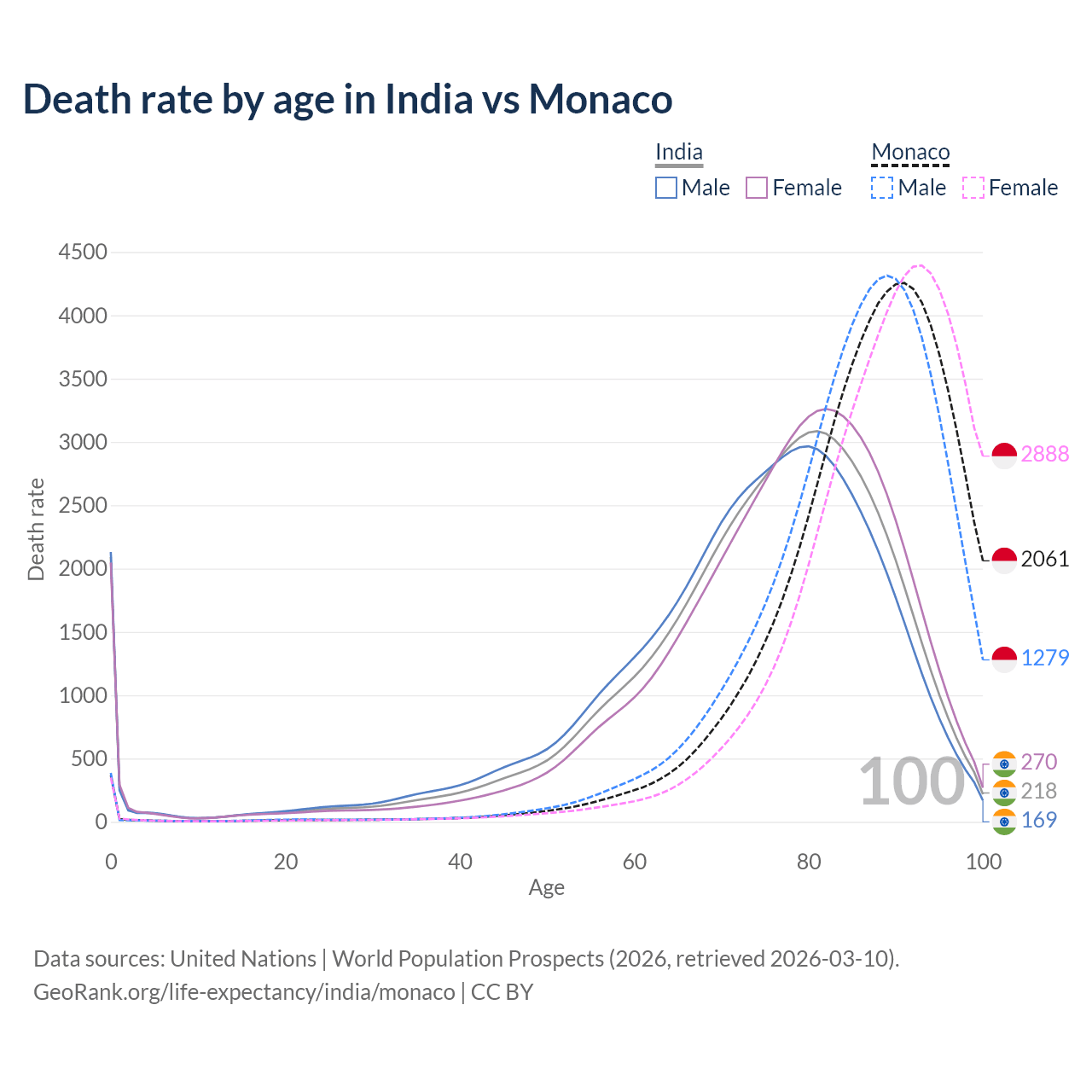 In India, the most common age of death is 81, compared to 91 in Monaco. The median age of death is 76.8 in India and 88.7 in Monaco, meaning only half of each cohort is expected to live past that age.