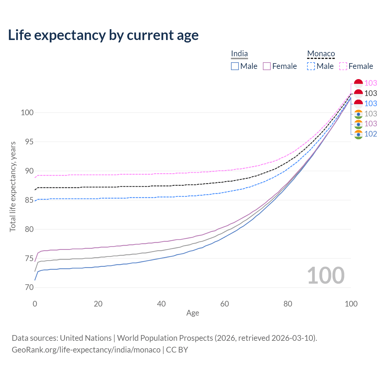 This life expectancy calculator shows the odds of living to 100, 95, 90, and below based on current age for both males and females in India and Monaco, along with mean and median age of death. The calculations are based on the 2026 life tables (actuarial tables) from the UN World Population Prospects.