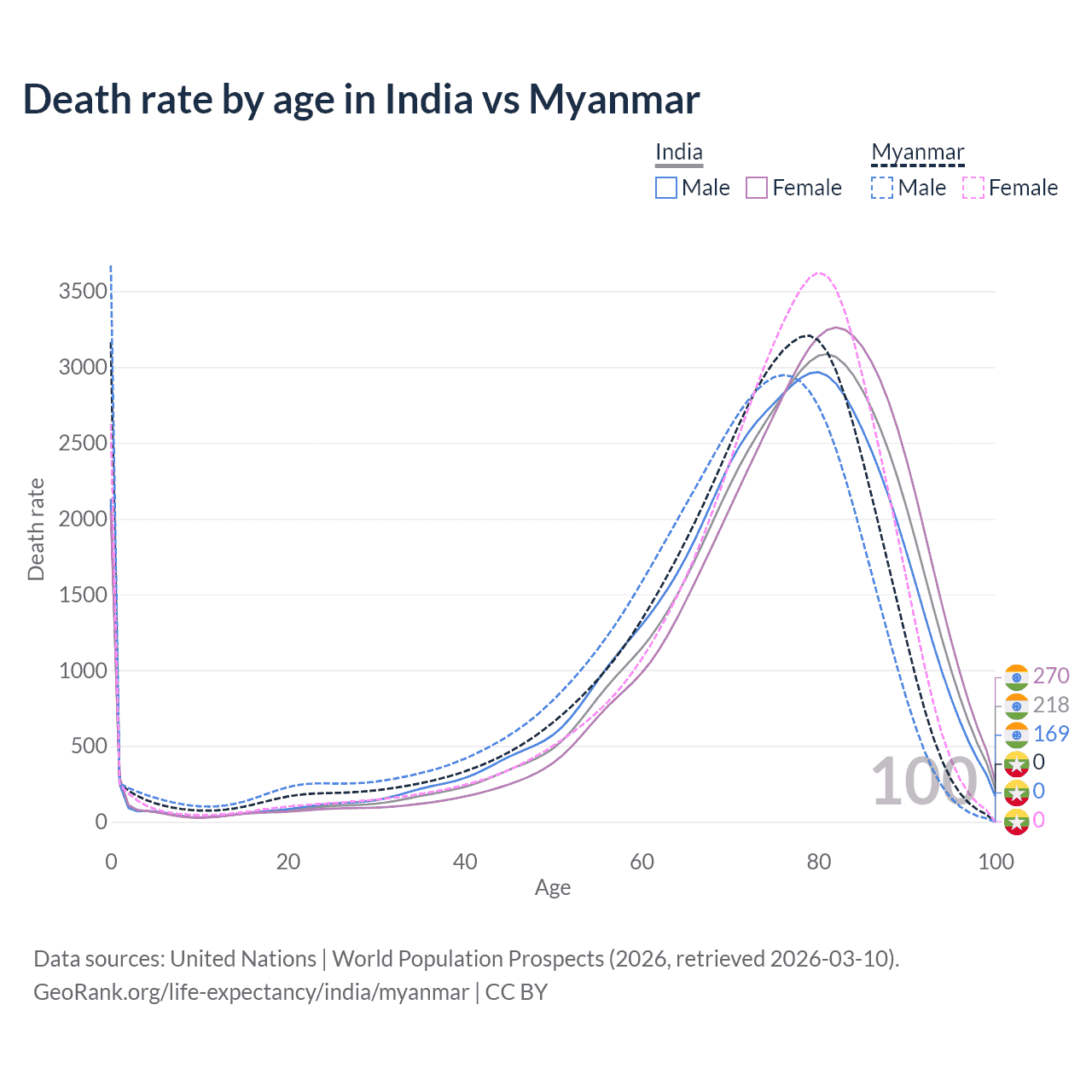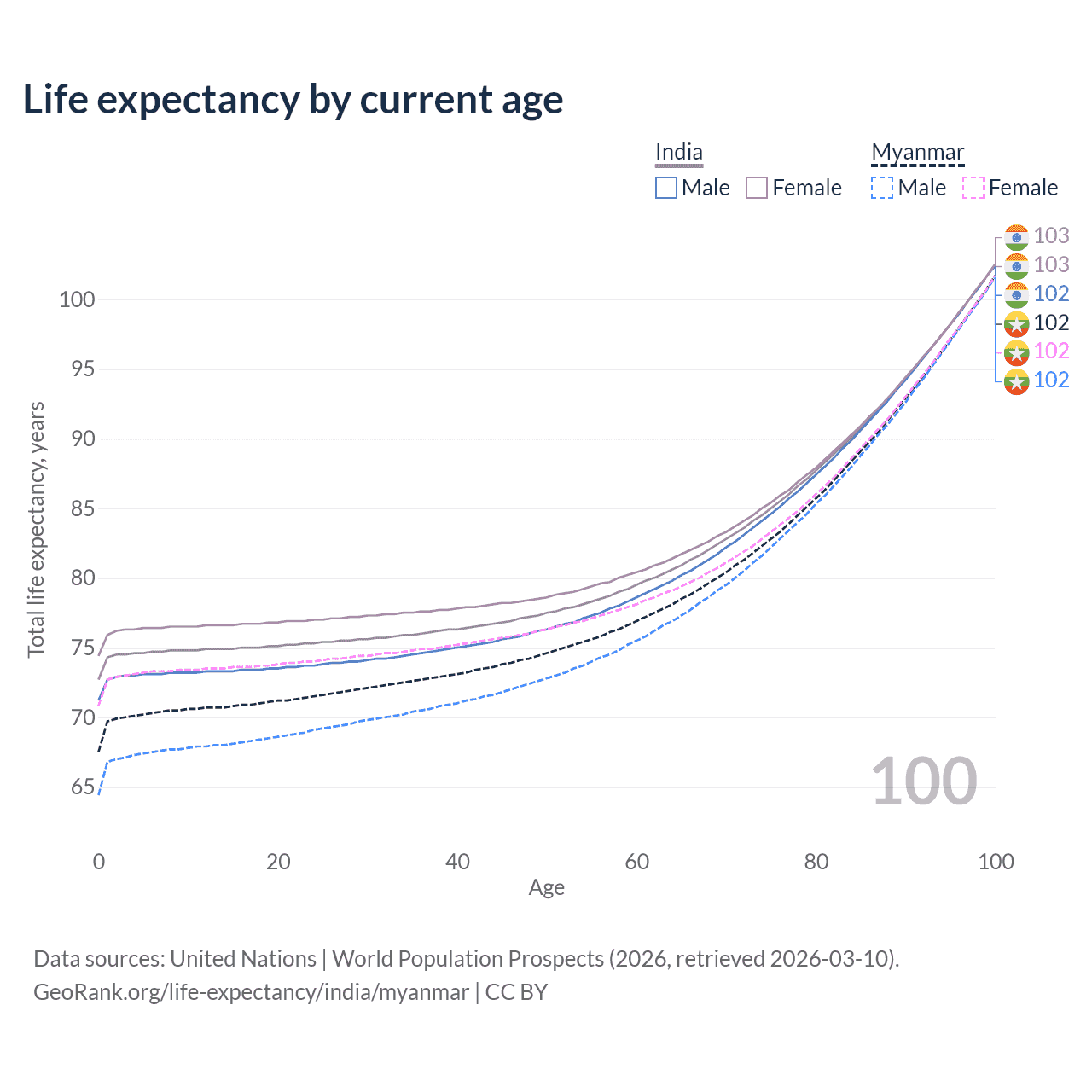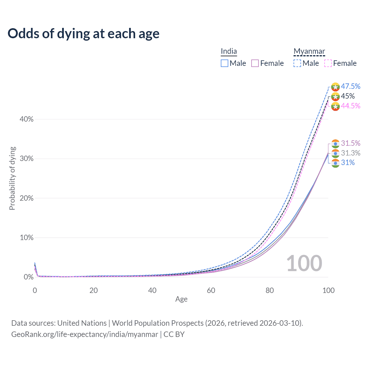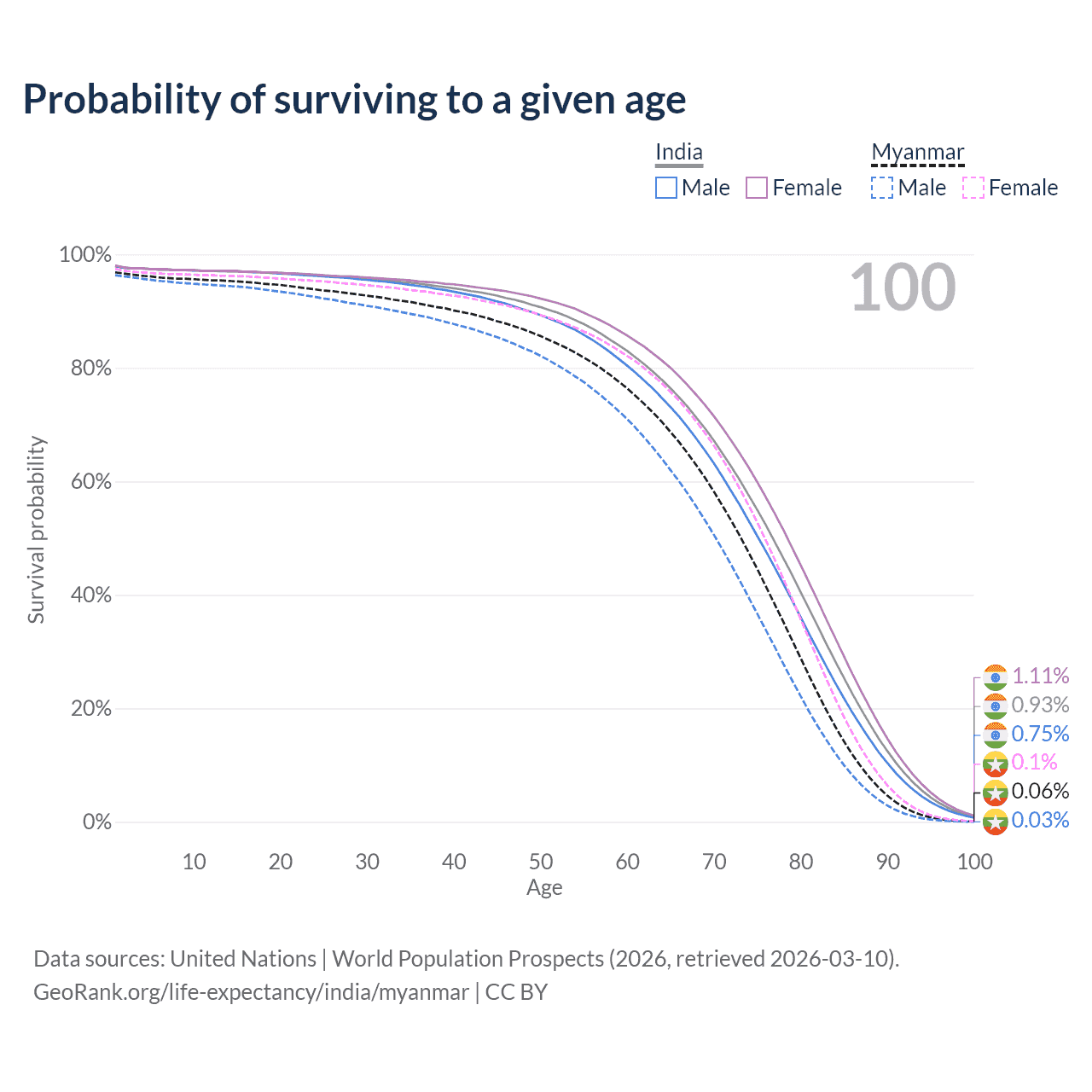 This life expectancy calculator shows the odds of living to 100, 95, 90, and below based on current age for both males and females in India and Myanmar, along with mean and median age of death. The calculations are based on the 2026 life tables (actuarial tables) from the UN World Population Prospects.