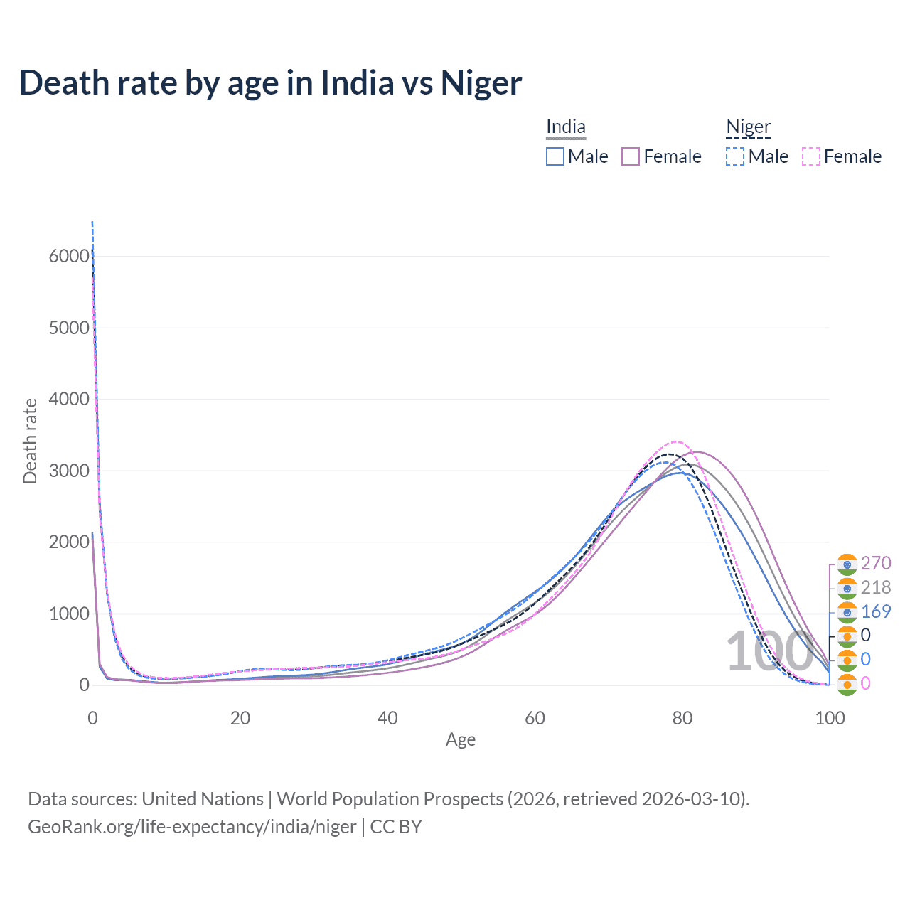 In India, the most common age of death is 81, compared to 0 in Niger. The median age of death is 76.8 in India and 71.7 in Niger, meaning only half of each cohort is expected to live past that age.