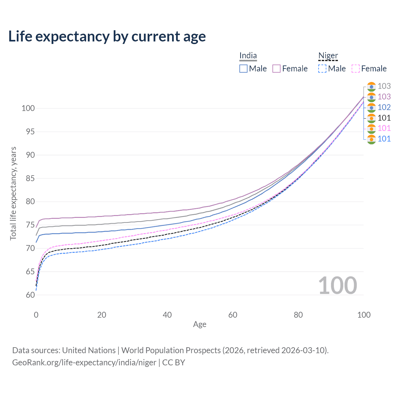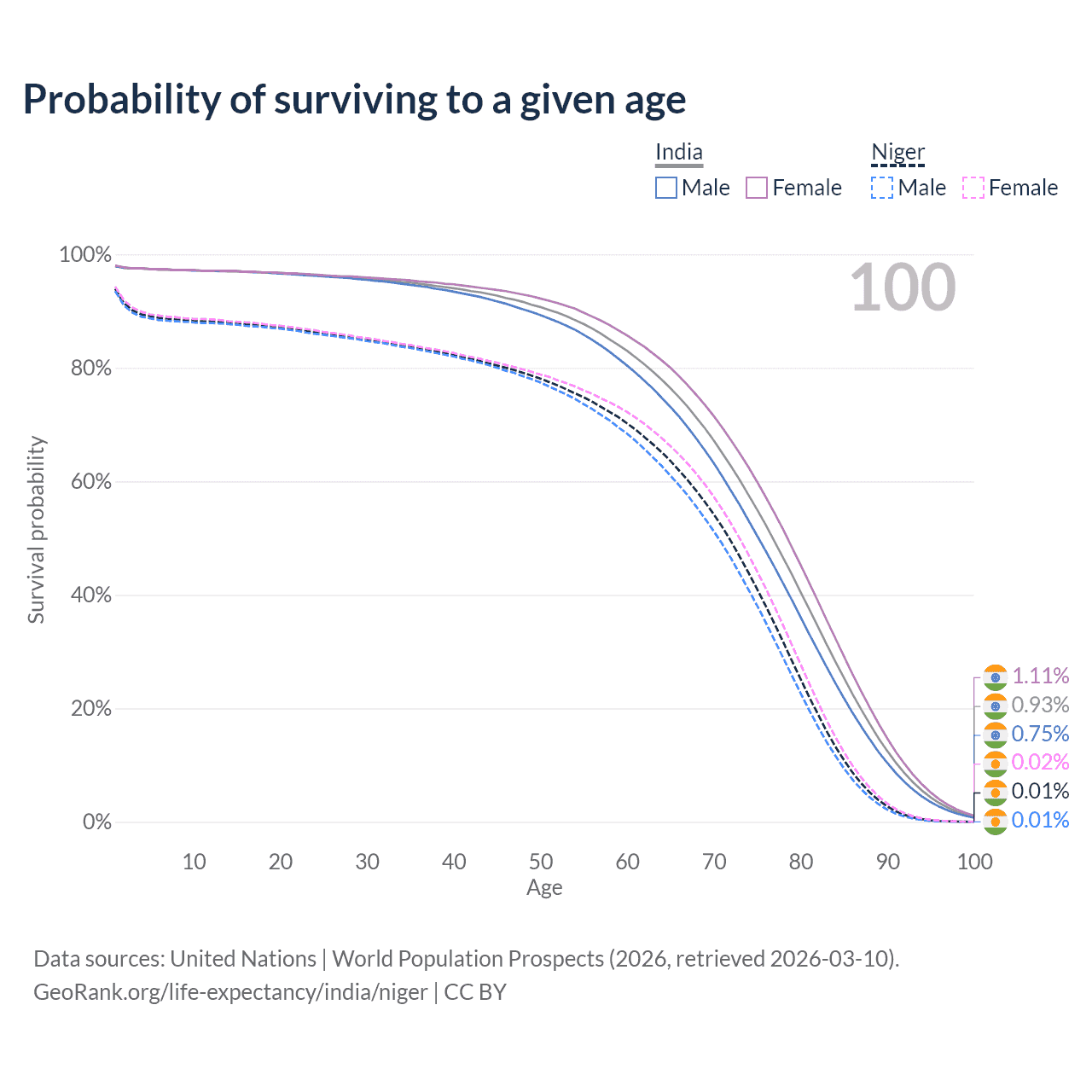This life expectancy calculator shows the odds of living to 100, 95, 90, and below based on current age for both males and females in India and Niger, along with mean and median age of death. The calculations are based on the 2026 life tables (actuarial tables) from the UN World Population Prospects.