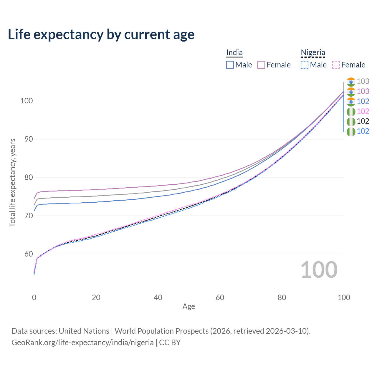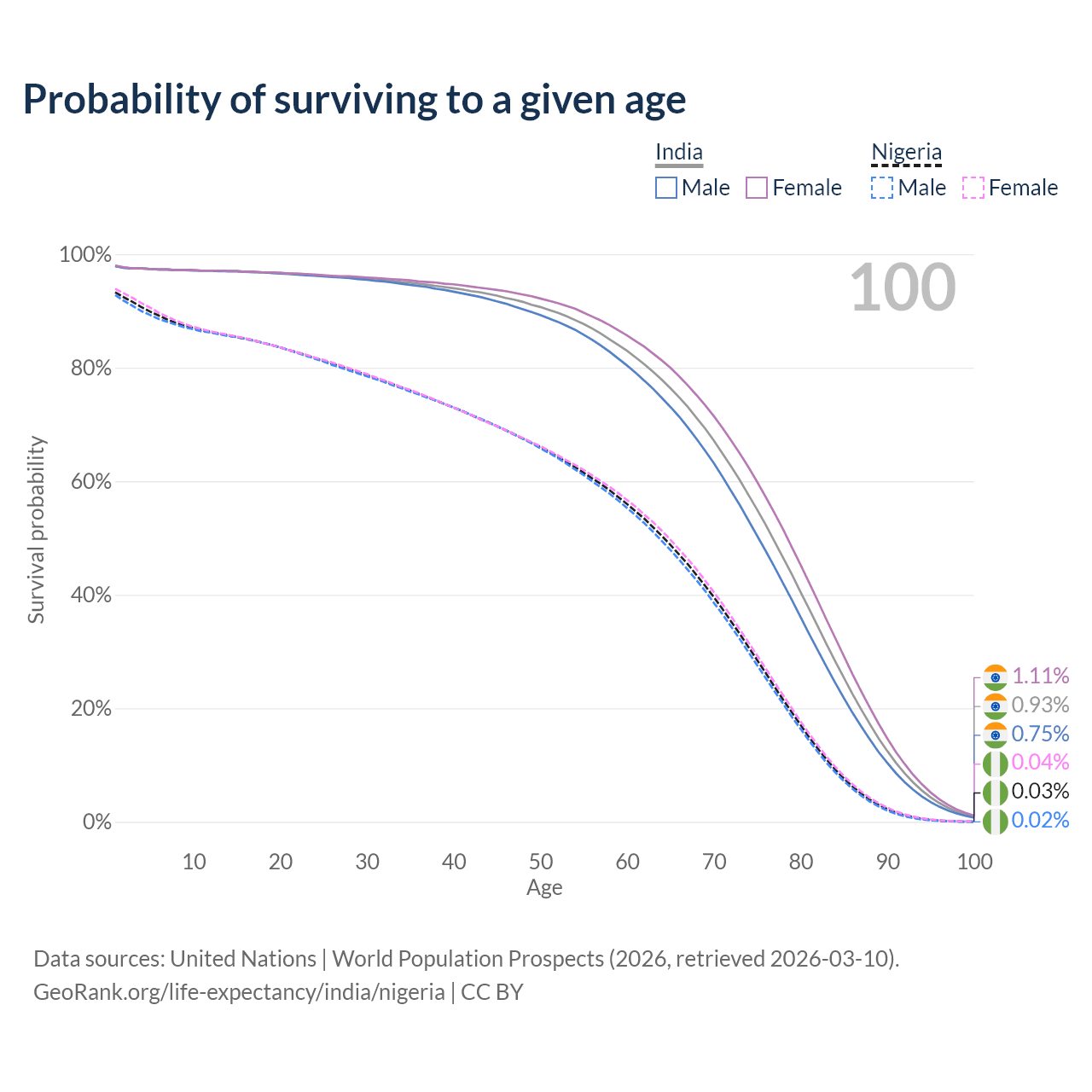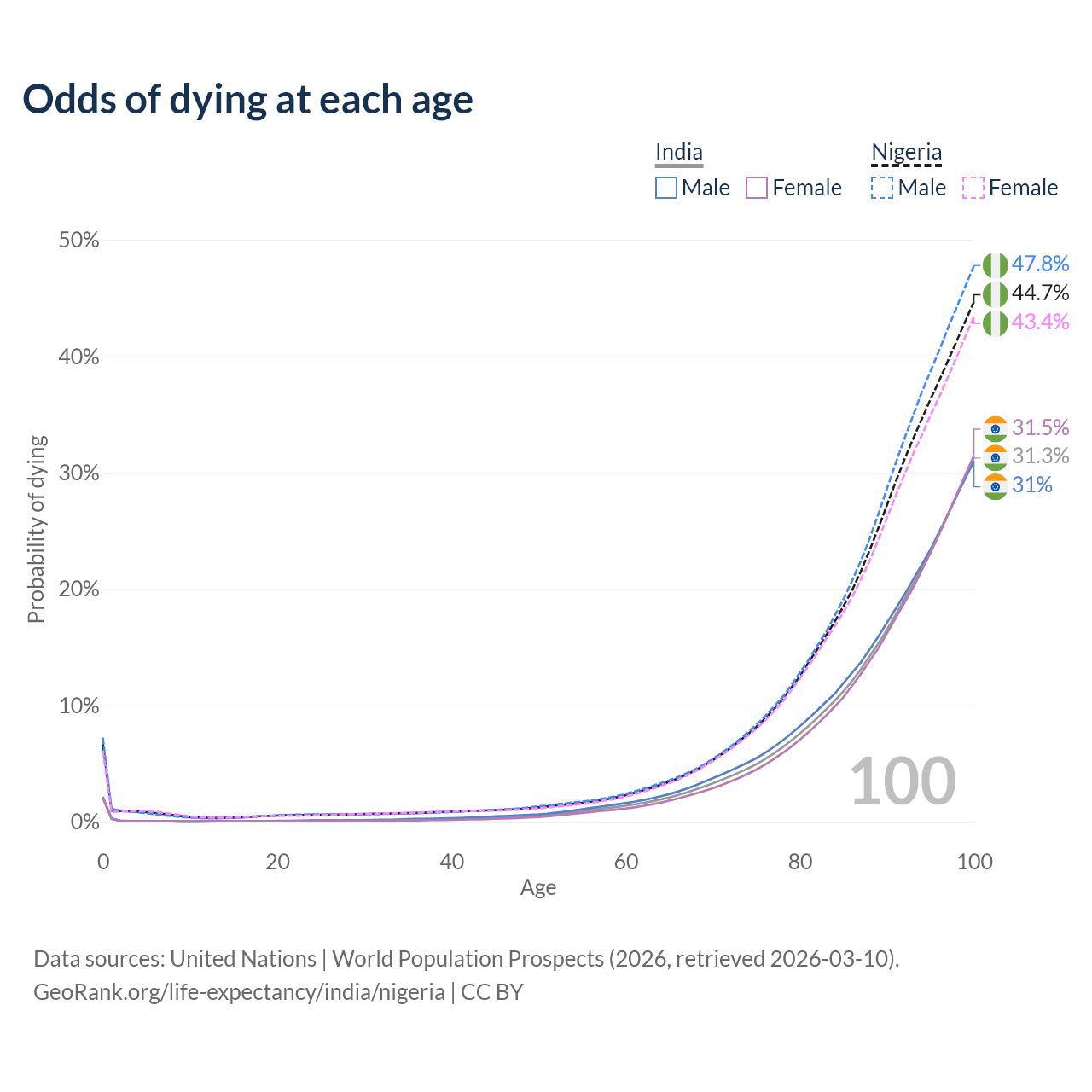 This life expectancy calculator shows the odds of living to 100, 95, 90, and below based on current age for both males and females in India and Nigeria, along with mean and median age of death. The calculations are based on the 2026 life tables (actuarial tables) from the UN World Population Prospects.